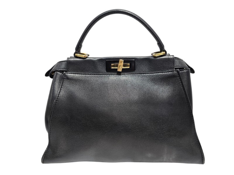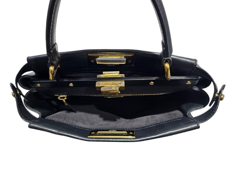 Introducing the Fendi Peekaboo Black Leather Bag—a timeless classic that exudes sophistication and luxury. Crafted from premium black leather, this iconic bag features the signature Peekaboo design, which reveals a luxurious suede interior when opened. The contrasting textures of smooth leather and plush suede create a refined, chic look that speaks volumes about the craftsmanship behind this beautiful piece.