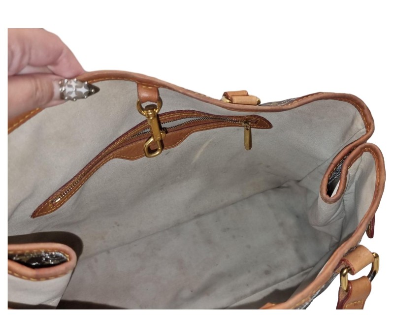Condition: This item is in worn condition showing visible signs of wear and use. No major damage to the general pattern of the bag but lining shows some cracks at the base. A few stains and wear on the leather handles and rim detailing and many stains on the inner material of the bag.