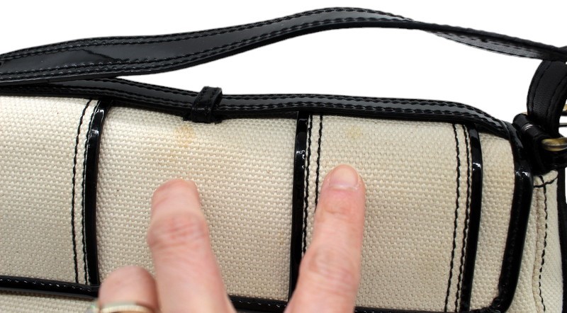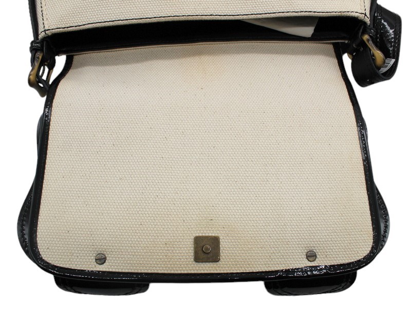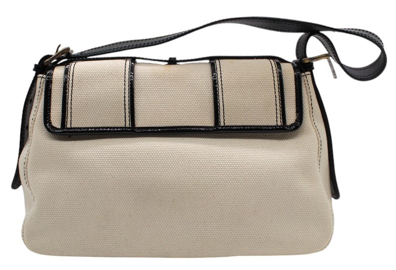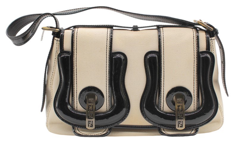 Fall in love instantly with this gorgeous B bag by Fendi. Crafted from black patent leather and canvas this piece will smoothly last you season after season.