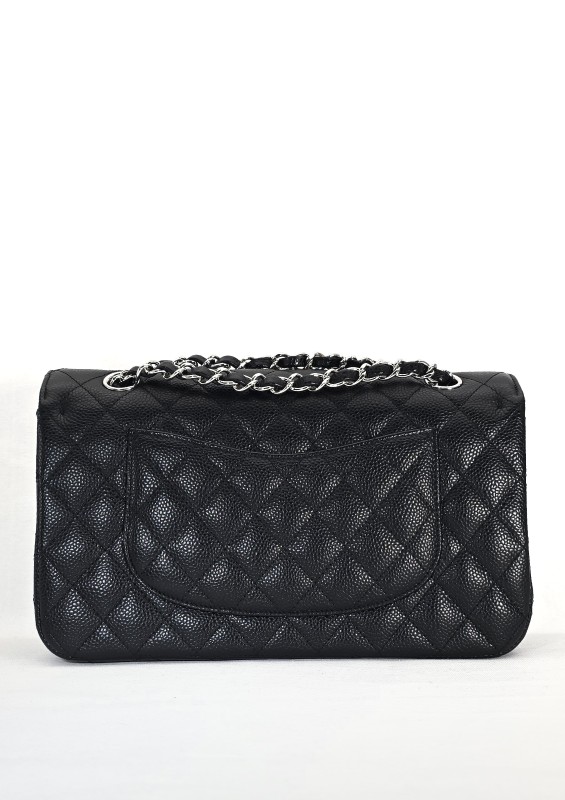 Crafted from this textured, scratch-resistant calfskin, the bag maintains its shape beautifully and is often considered the most practical leather option Chanel offers. The exterior features the signature diamond quilting and classic CC turn-lock closure, complemented by a leather-interwoven chain strap that can be worn either doubled on the shoulder or extended for a longer drop.
