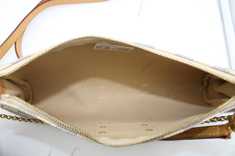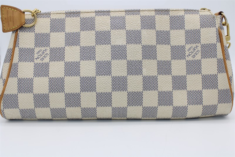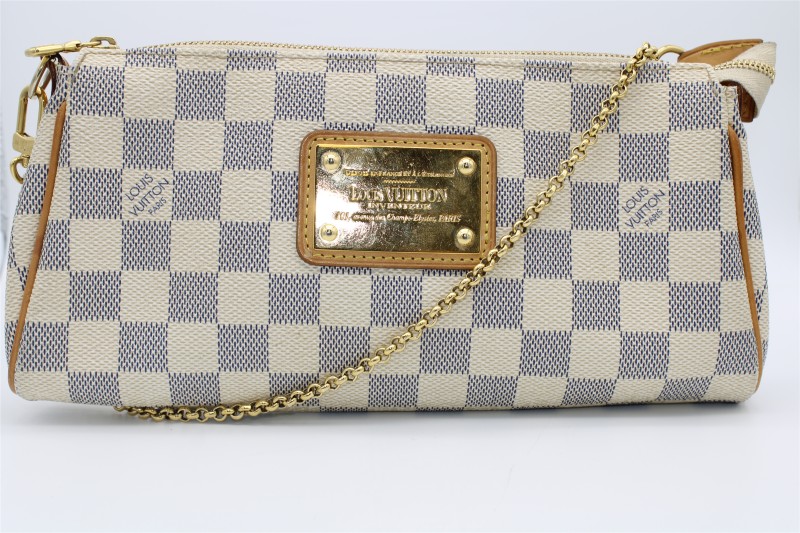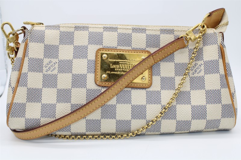 This stunning LOUIS VUITTON EVA DAIMER AZUR purse is a versatile and fashionable accessory. Crafted with the brand's iconic Damier Azur canvas, it features a sleek and structured design that can effortlessly transition from day to night. The included extra strap allows for hands-free carrying, while the protective dustbag helps maintain the bag's pristine condition.
