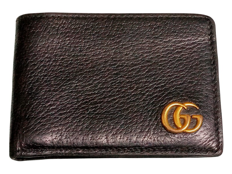 This Gucci Marmont Leather Bi-Fold wallet is a sleek and sophisticated accessory designed for the modern gentleman. Crafted from premium leather, it features a bi-fold design that offers ample storage space for cards, cash, and other essentials. The Gucci logo embellishment adds a touch of luxury, while the compact size ensures it fits comfortably in your pocket or bag.