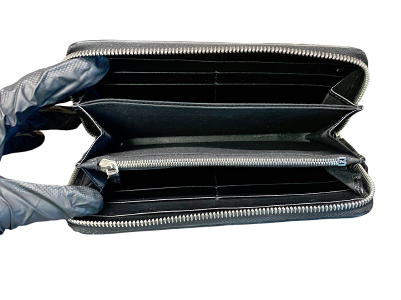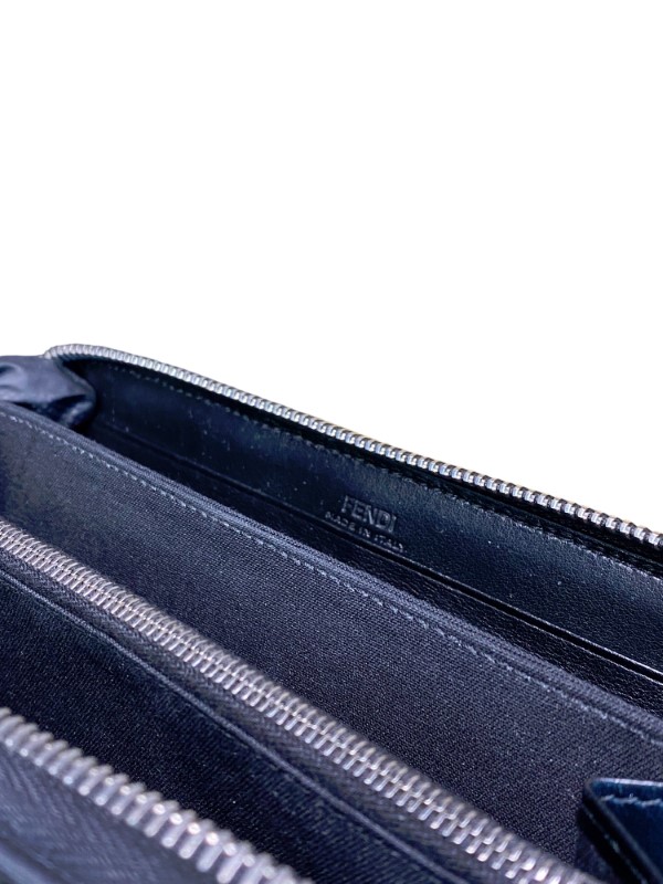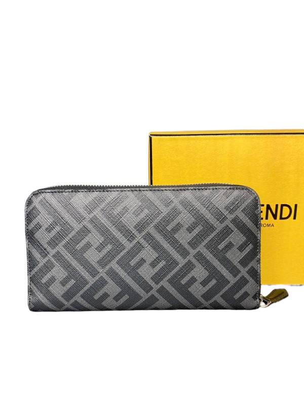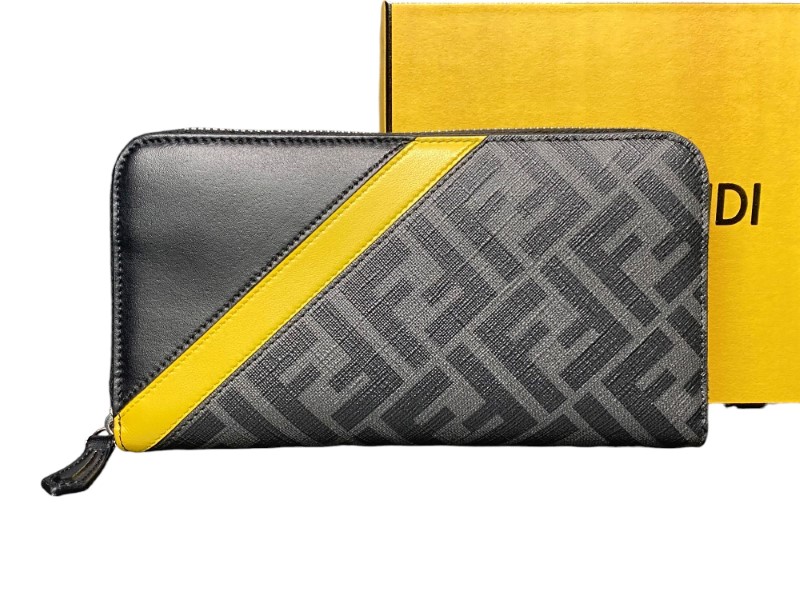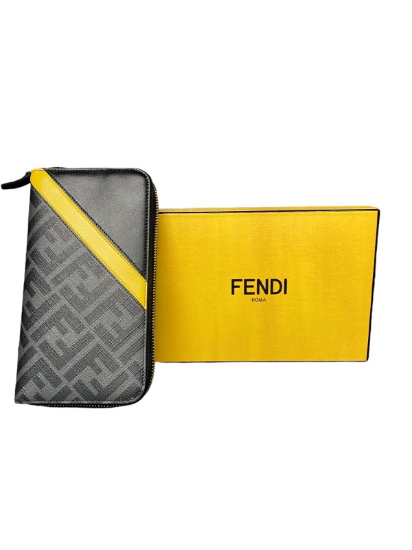 Wallet with zip. Organised into three gusseted compartments with eight card slots and a zip pocket. Made of grey textured weave fabric with FF motif. Embellished with black leather insert and inlaid detail in yellow. Black leather lining.