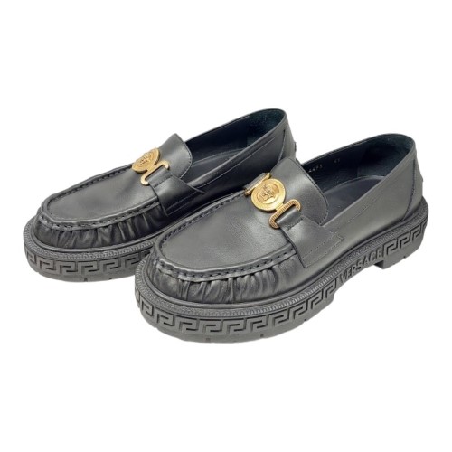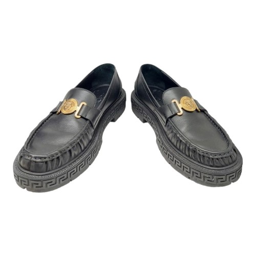 This classic pair of Versace leather loafers is a stylish and versatile addition to any man's wardrobe. Crafted with high-quality materials, these shoes feature a sleek and sophisticated design that can be dressed up or down to suit any occasion. The comfortable leather construction and well-cushioned insole ensure all-day wearability, while the iconic Versace branding adds a touch of luxury.