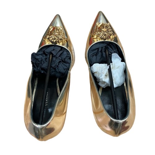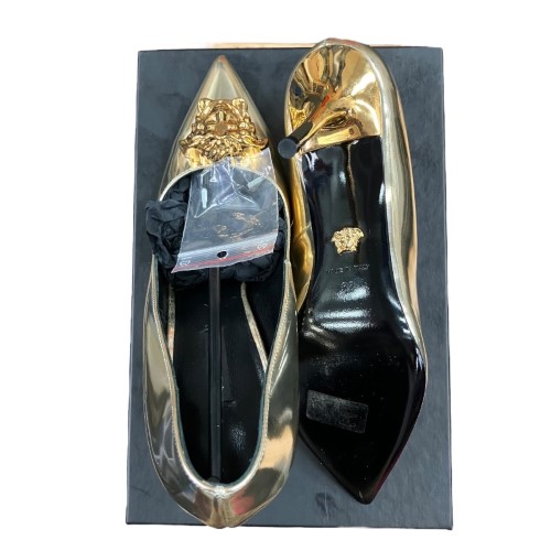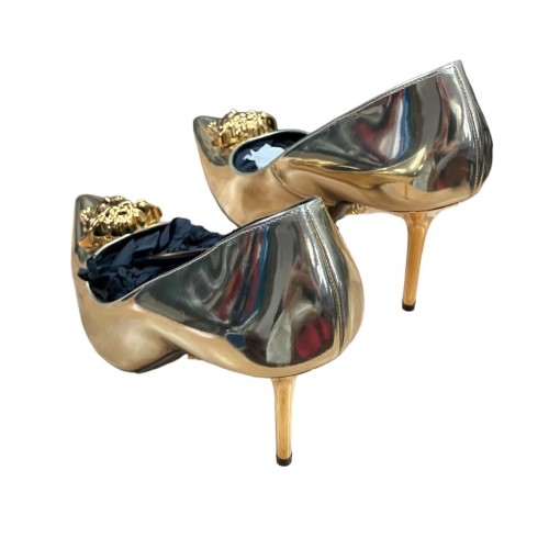 Make a bold statement with the Versace Medusa Gold Pumps, size 38. These luxurious heels feature the iconic Medusa emblem, adding a touch of opulence and elegance to their stunning gold finish. Crafted with meticulous attention to detail, these pumps offer a blend of sophisticated style and superior comfort. Perfect for any special occasion or to elevate your everyday ensemble, the Medusa pumps are a statement piece that embodies Versace's renowned craftsmanship and glamorous design.