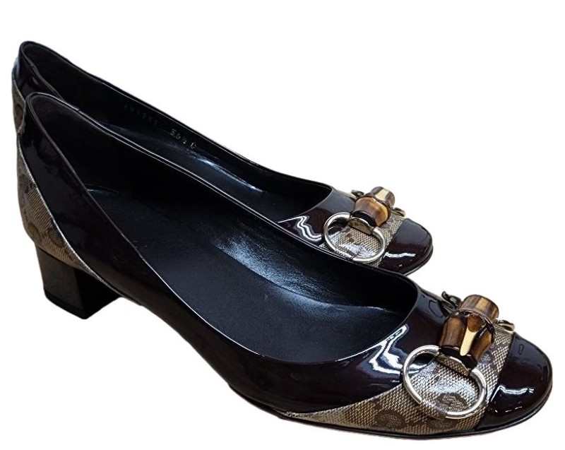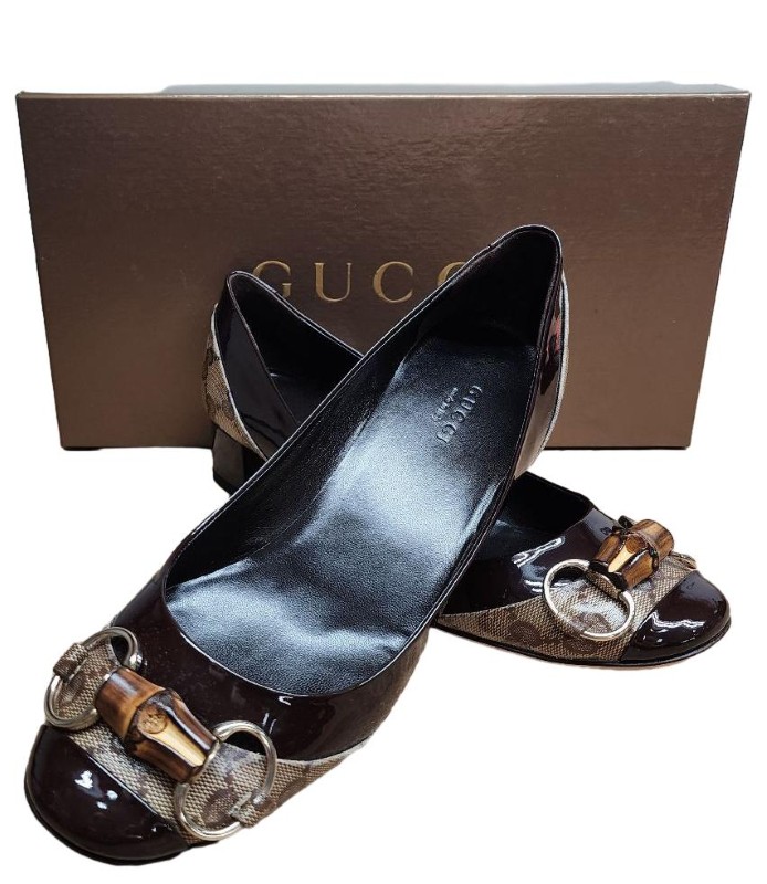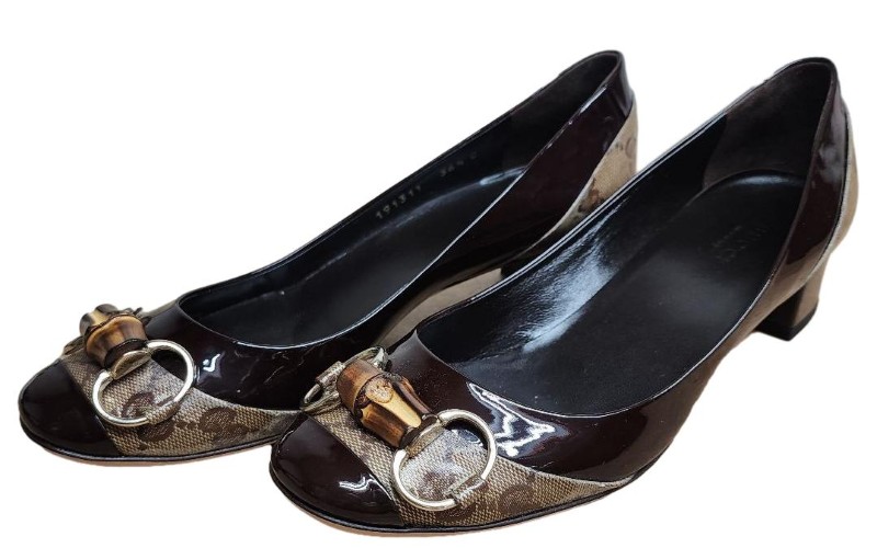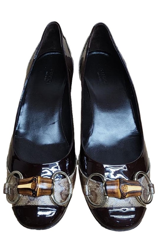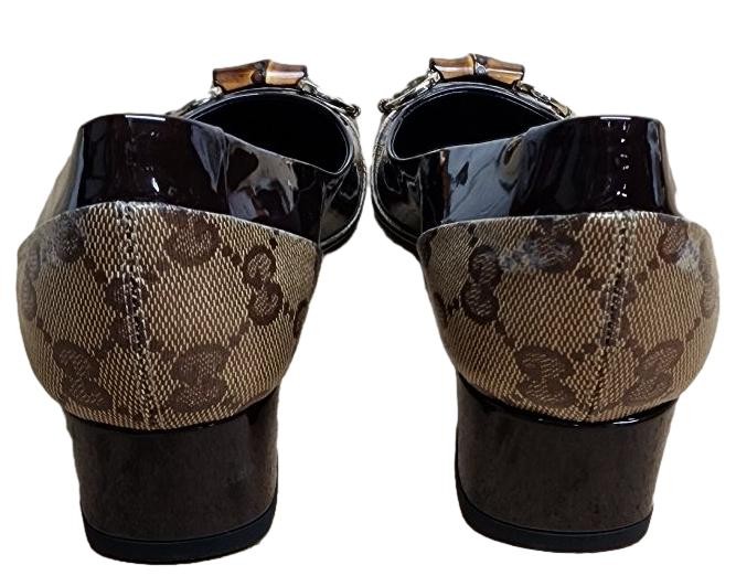 Timeless sophistication meets modern elegance in this exquisite GUCCI Vintage Monogram Bamboo Horsebit Pump. Crafted with the brand's iconic monogram pattern and accented with a sleek bamboo-inspired horsebit detail, this shoe exudes a refined, vintage-inspired aesthetic that seamlessly transitions from day to night. The classic pump silhouette offers a sophisticated and versatile look, perfect for elevating any ensemble.