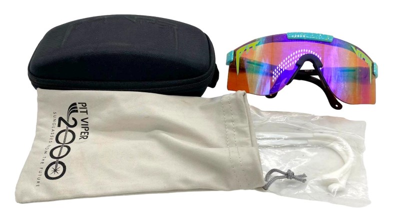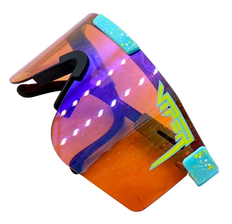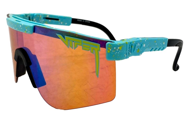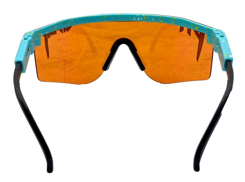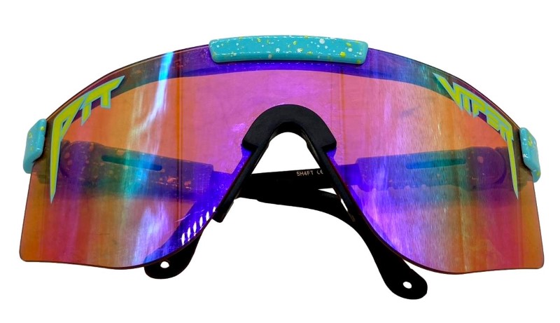 These Pit Viper The 2000s sunglasses boast a rimless design that features a vibrant blue and teal patterned frame that's been fitted with a matching blue mirror lens to ensure a protective yet fashionable fit for everyday wear.