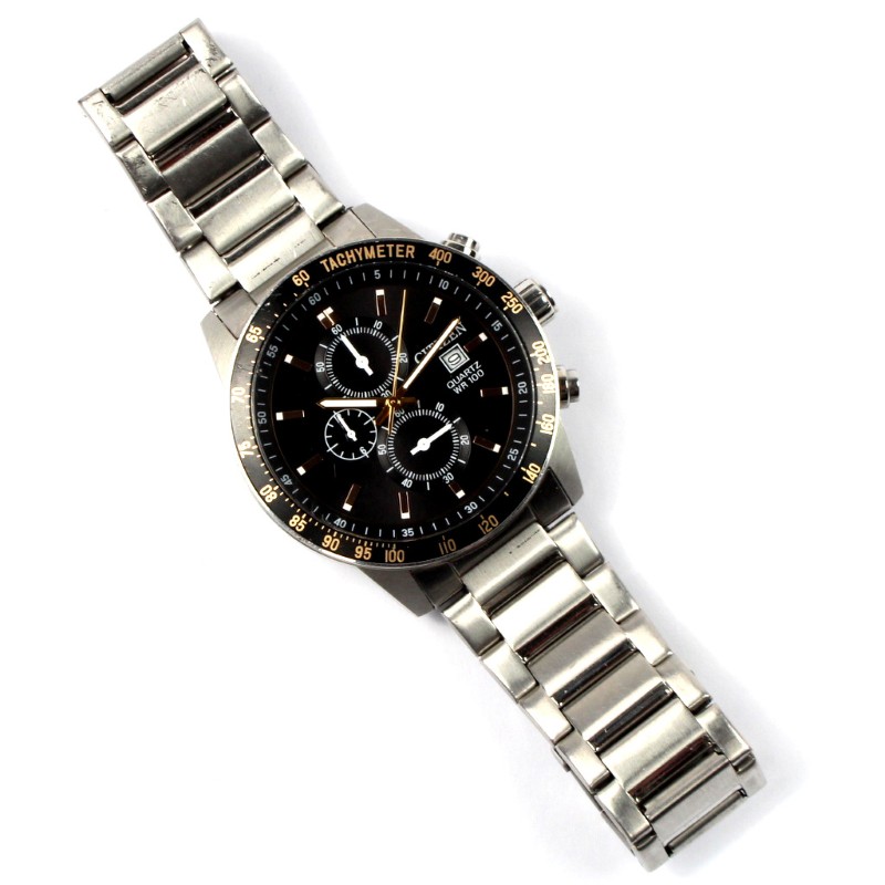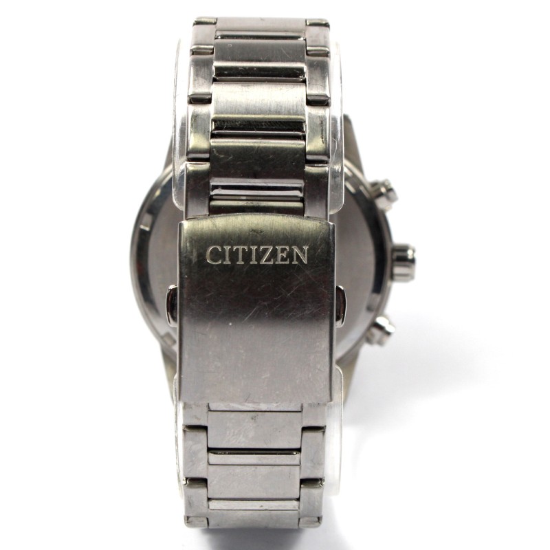 This sleek and sophisticated CITIZEN AN3681-57E 44mm Chronograph Men's Watch features a stunning silver metal band and a classic circular face in a bold black hue. The metal face boasts a functional chronograph display, offering a range of practical timekeeping features. With its durable construction and stylish design, this pre-owned timepiece is a versatile accessory suitable for both casual and formal occasions.