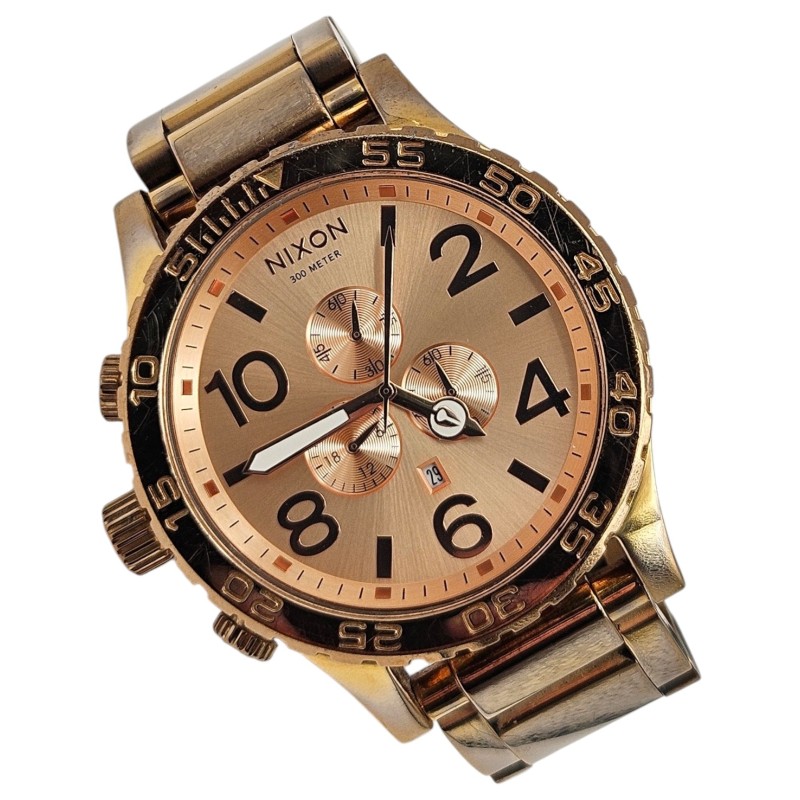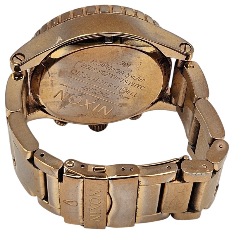 This pre-owned NIXON THE 51-30 CHRONO watch is a stylish and durable timepiece that will complement any casual or formal attire. Crafted with a metal band, this watch offers a classic and sophisticated look that is suitable for men. The chronograph function allows for precise time-keeping, making it a practical choice for those with an active lifestyle.