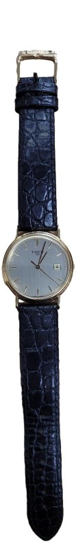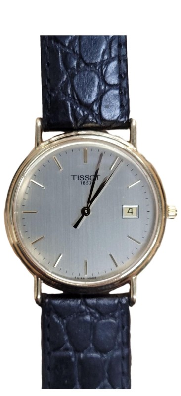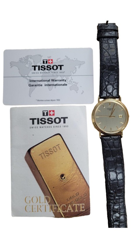 This stunning TISSOT T71.3.434.21 CARMEL 18K GOLD CASE (12.02gr) watch is a sophisticated dress timepiece that exudes elegance. The round face features a gold colour and dashes display, complemented by a sleek black leather band. The 18K gold case add a touch of luxury to this versatile accessory. Suitable for both formal and casual occasions, this pre-owned TISSOT watch is a timeless addition to any wardrobe.