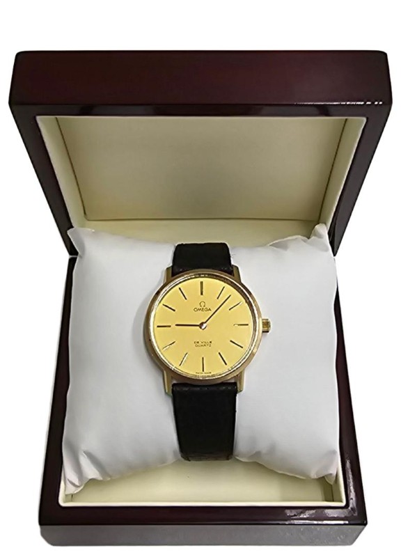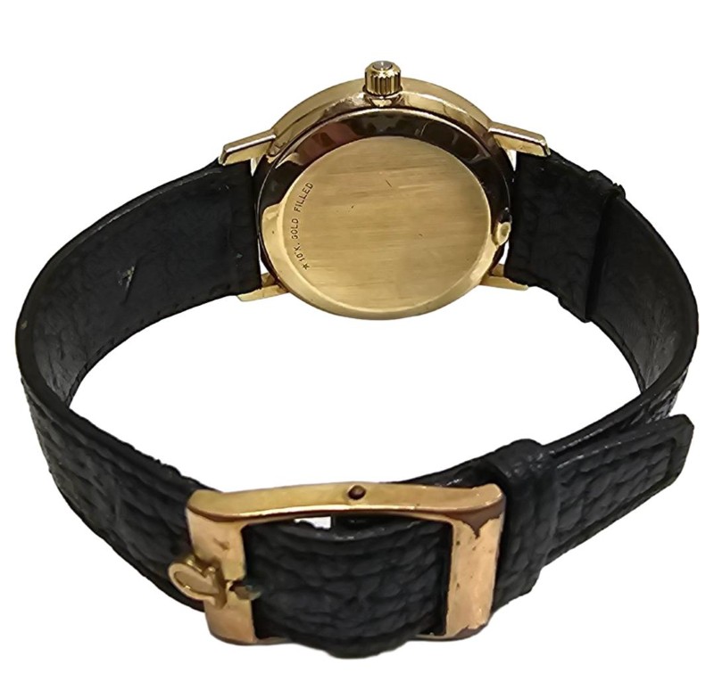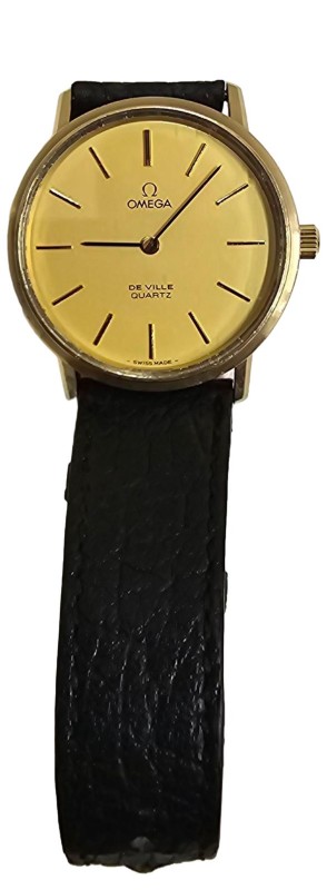 This vintage OMEGA De Ville Quartz watch from 1973 is a timeless classic that exudes sophistication. Crafted with a sleek black leather band and a stunning gold-plated face, this dress watch boasts a circular design and a clean numerical display. The 10K gold-filled engraving adds a touch of elegance, making this a truly remarkable timepiece.