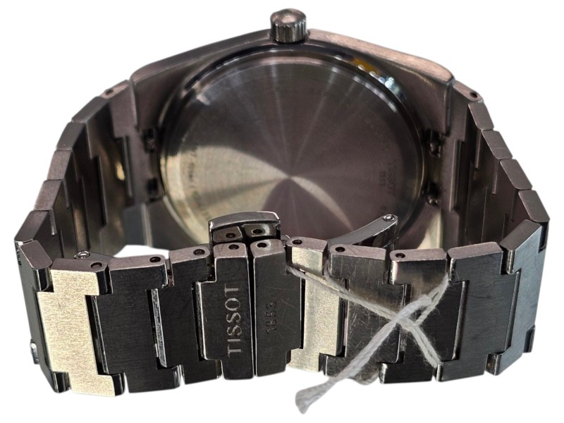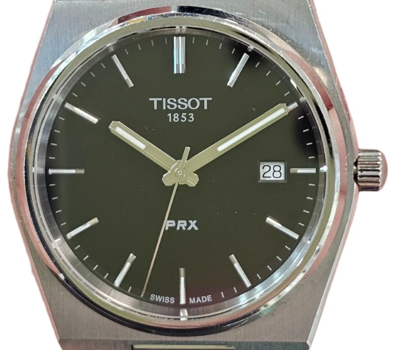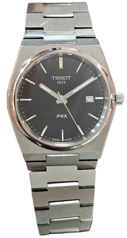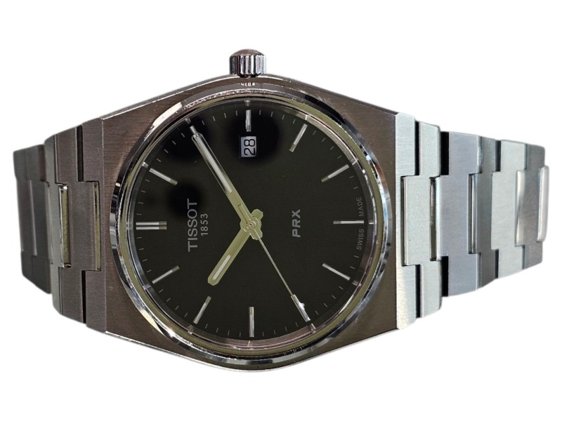 This TISSOT PRX t137 410a dress watch features a sleek and sophisticated design. The silver metal band complements the black metal face, which displays the time with clear, easy-to-read numbers. The circular face shape provides a classic, timeless look. Suitable for everyday wear or dressier occasions, this secondhand watch is a versatile accessory for the modern gentleman.