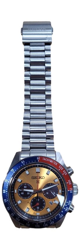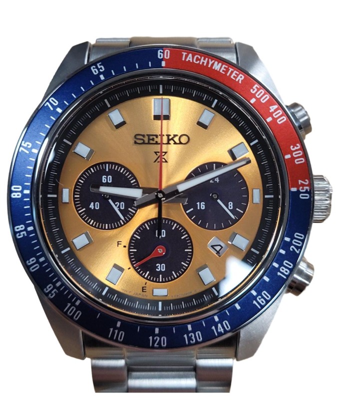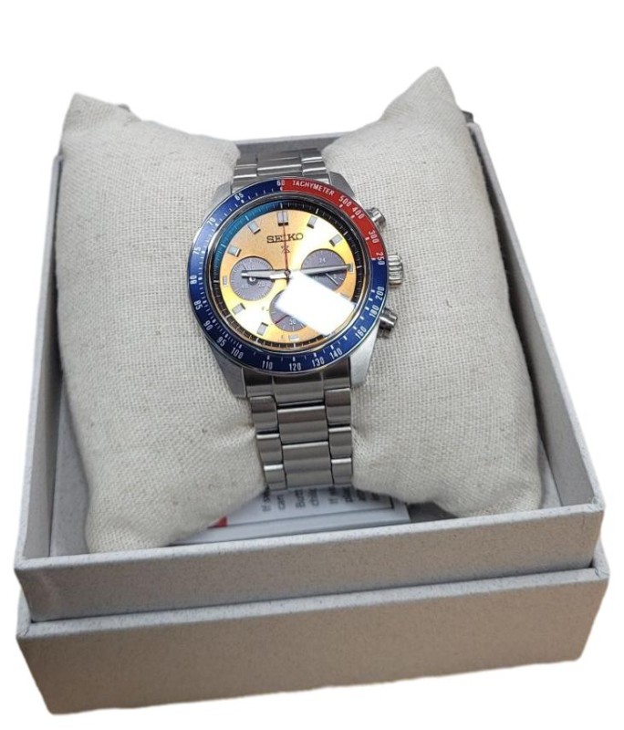 This Seiko Prospex Speedtimer watch features a striking orange dial with dashes, encased in a sleek stainless steel frame. The sapphire crystal face provides exceptional scratch resistance, while the silver stainless steel band offers a comfortable and durable fit. Designed for men, this chronograph timepiece is perfect for those with an active lifestyle, offering precise timekeeping and a bold, sporty aesthetic.