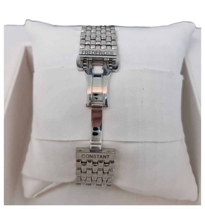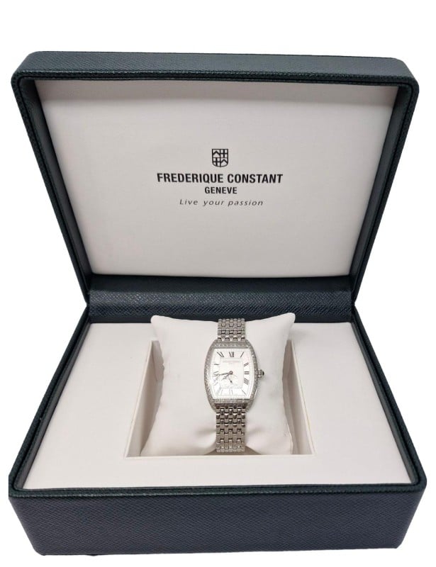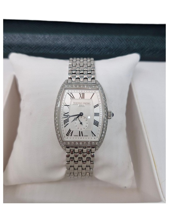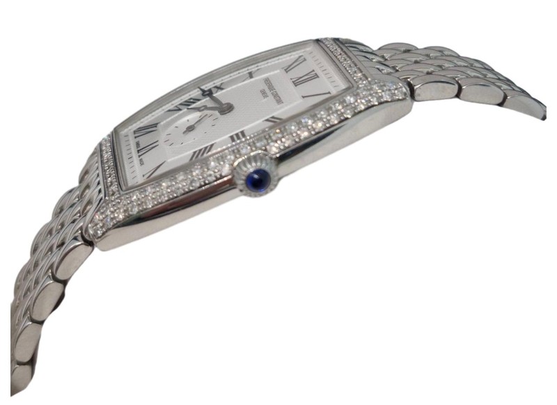 Silver-tone stainless steel case with a silver-tone stainless steel bracelet. Fixed silver-tone stainless steel set with 70 diamonds bezel. Silver dial with black hands and Arabic numeral hour markers. Minute markers around the outer rim. Dial Type: Analog. Seconds sub-dial above the 6 o'clock position subdials. Frederique Constant Calibre FC-235 quartz movement. Scratch resistant sapphire crystal. Solid case back. Tonneau case shape. Case size: 30.5 mm x 21.5 mm. Deployment with push button release clasp. Water resistant at 30 meters / 100 feet. Functions: hour, minute, second. Dress watch style. Watch label: Swiss Made. Frederique Constant Art Deco Ladies
