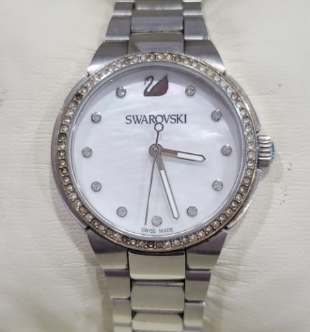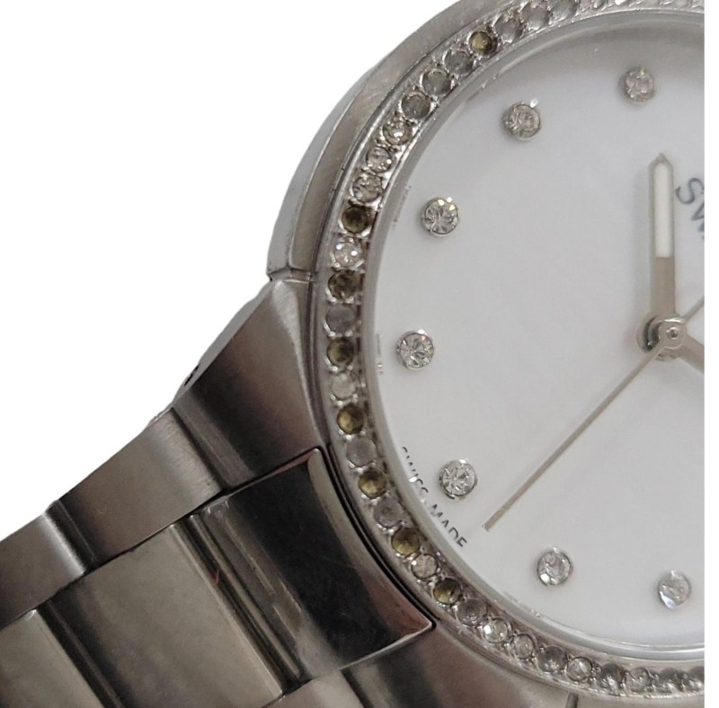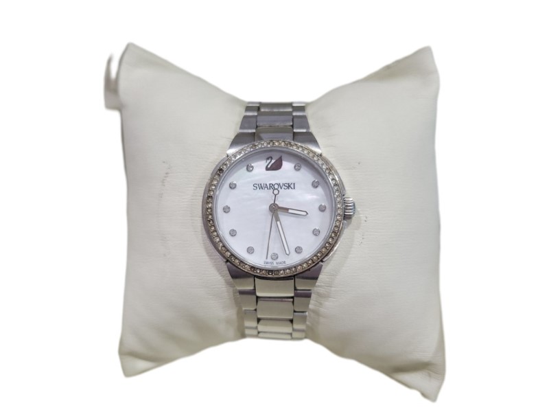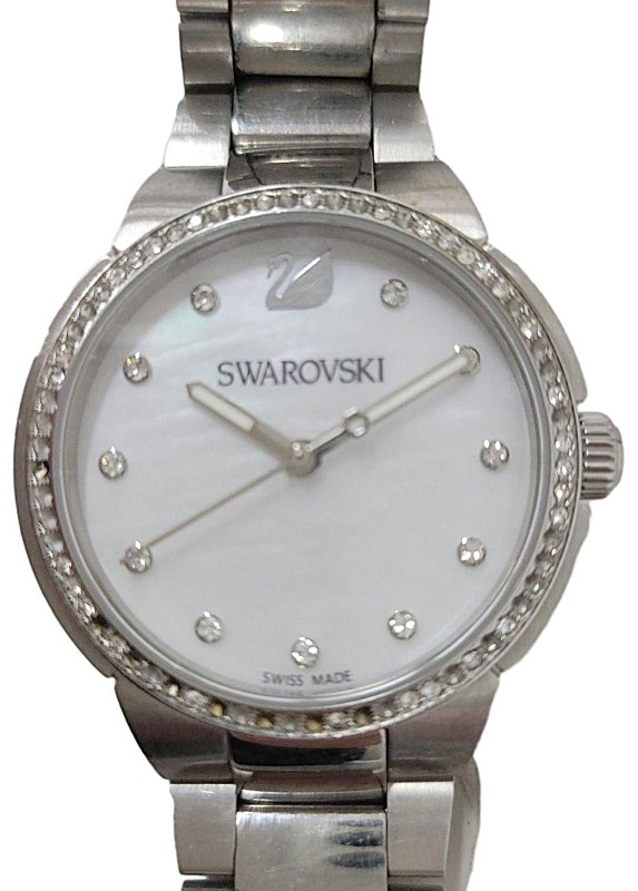 This elegant Swarovski ladies' dress watch features a round white face and a sleek silver metal band.