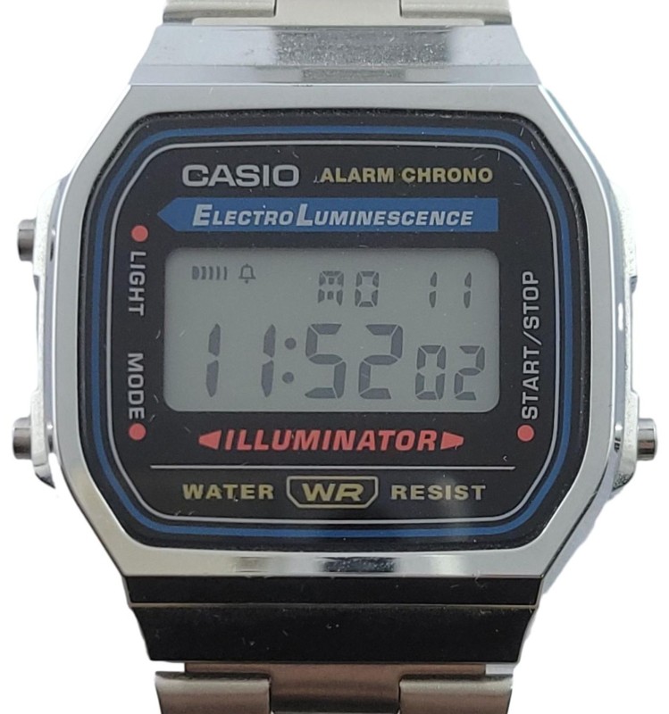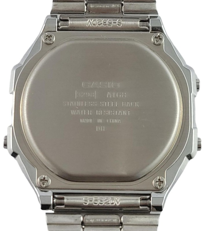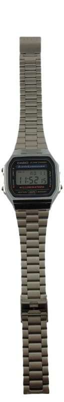 This classic CASIO A168 men's sports watch features a sleek silver metal band that complements the timepiece's sporty design.