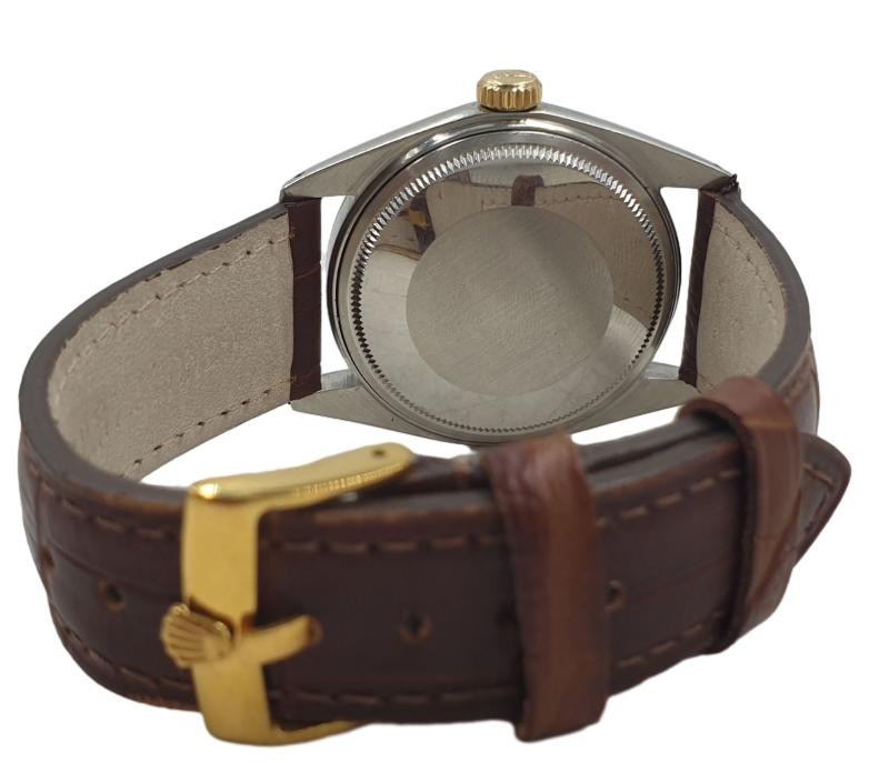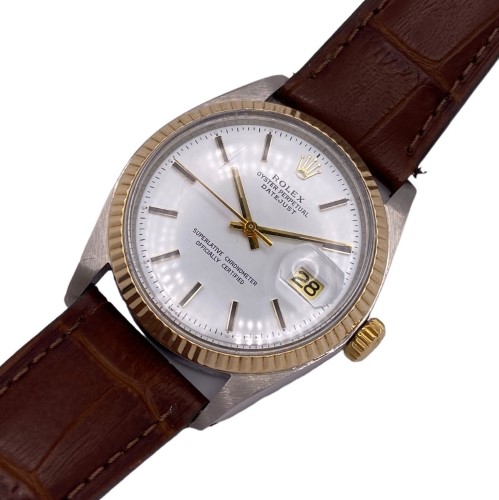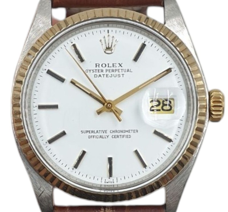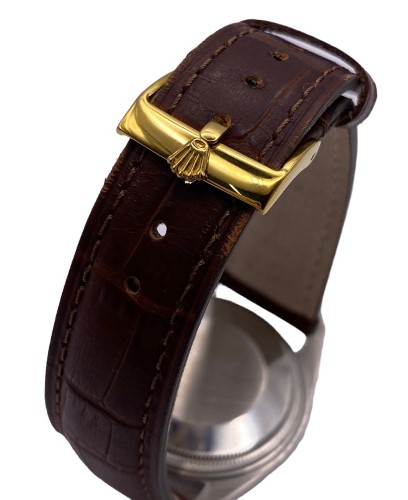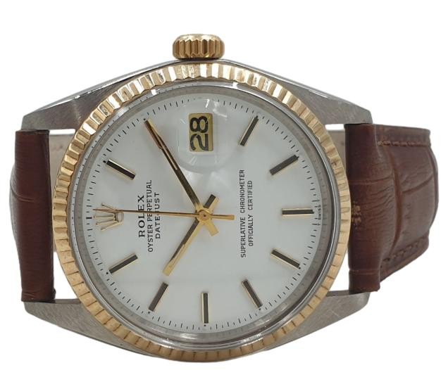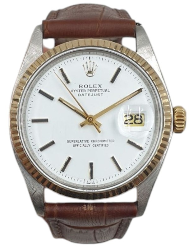 This pre-owned ROLEX 1601 dress watch features a classic round white face and a durable brown leather band. The watch has been serviced and the face has been replaced, ensuring reliable timekeeping. With its timeless design, this versatile timepiece can be dressed up or down to suit any occasion.