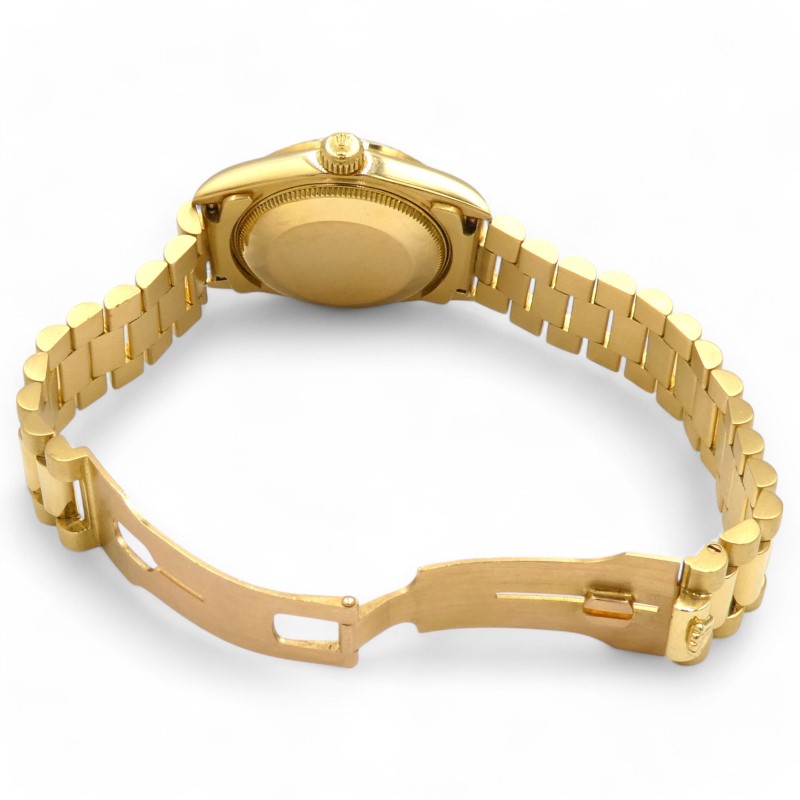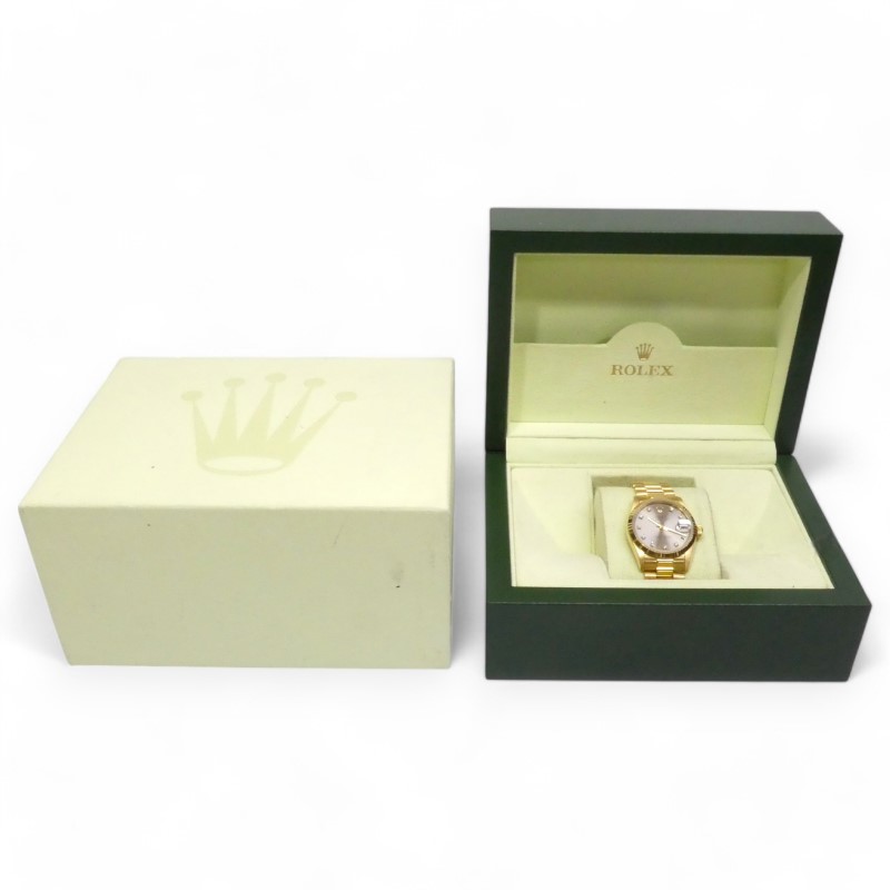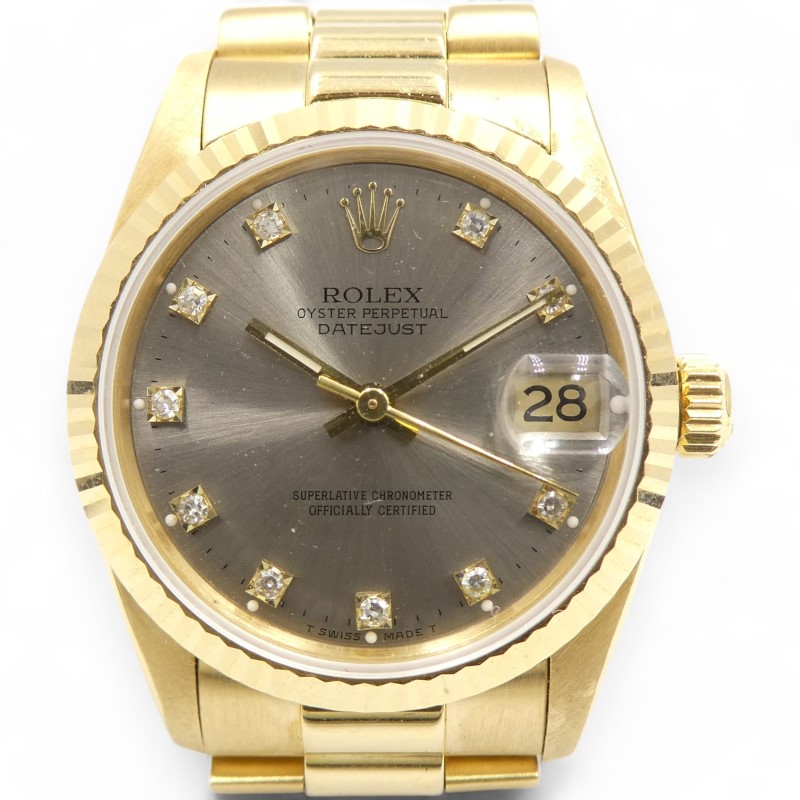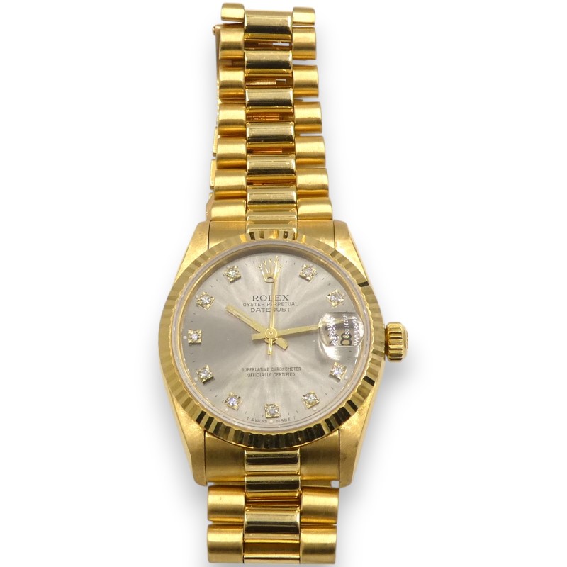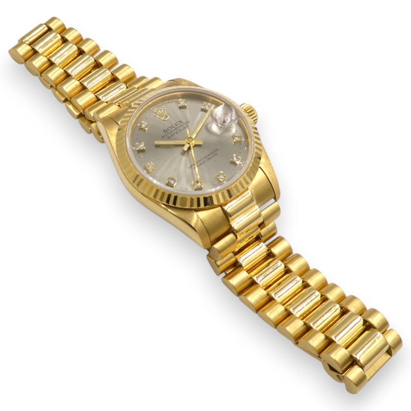 Ladies Rolex Oyster Perpetual DATEJUST 30mm Automatic 10 Diamond Set Silver Colour Dial with 18K Gold Fluted Bezel and 18K President Bracelet. This Piece has been professionally cleaned, polished and has been certified. Comes with Original Box, but no original paperwork.