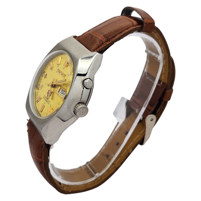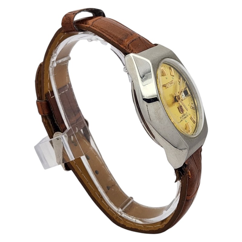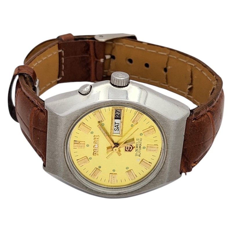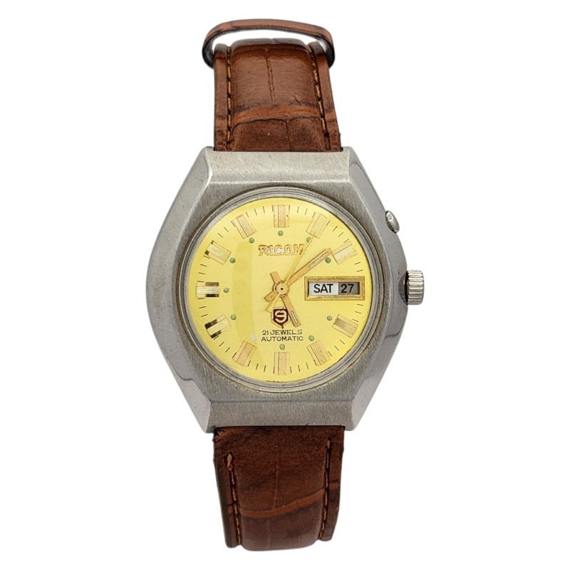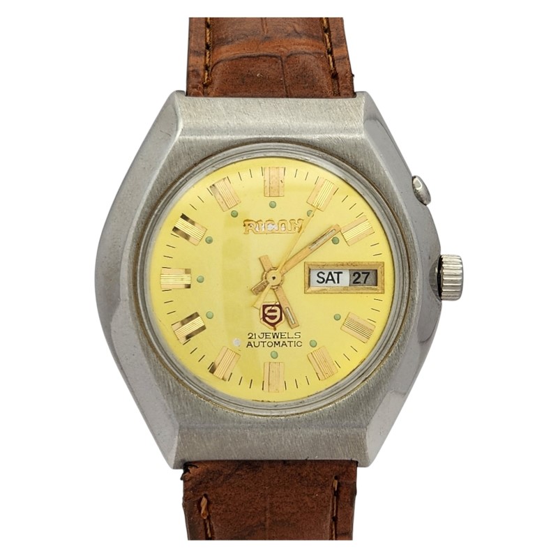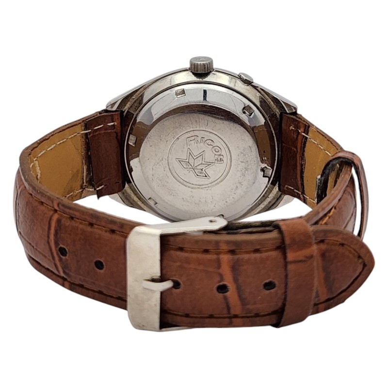 This vintage Ricoh 21 jewels automatic chronograph watch features a classic brown leather band that complements its timeless design. The unisex style makes it suitable for all-day wear, whether at the office or on the weekend. The automatic movement ensures reliable timekeeping, while the chronograph function allows for precise tracking of elapsed time. With its durable construction and elegant appearance, this pre-owned watch is a versatile accessory that will elevate any outfit.