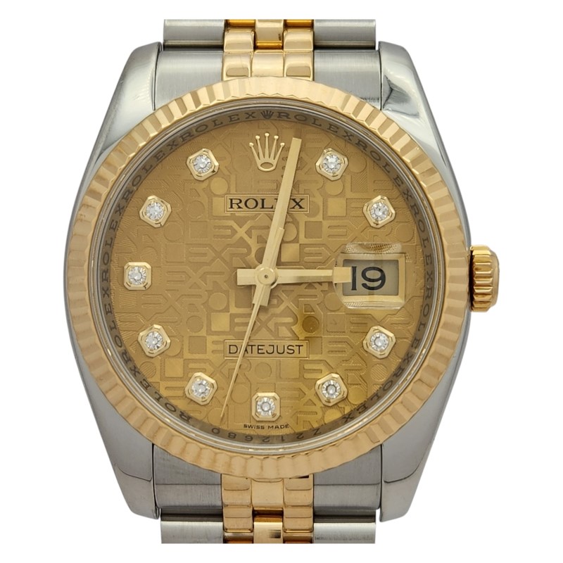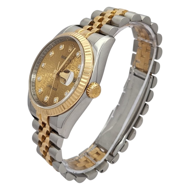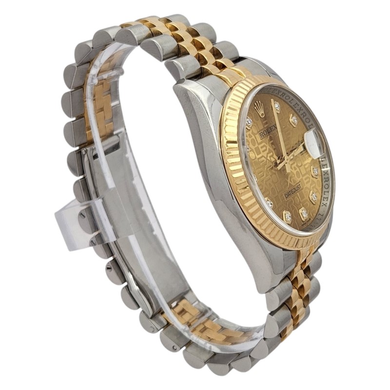This stunning Rolex 116233 Gold Computer Diamond Dial watch is a true testament to the brand's impeccable craftsmanship and timeless elegance. Featuring a captivating two-tone 18ct yellow gold and stainless steel construction, this timepiece exudes a refined and sophisticated aesthetic. The striking gold-toned face, crafted from a harmonious blend of 18ct yellow gold and stainless steel, perfectly complements the circular shape, creating a classic and elegant appearance. Designed with the modern gentleman in mind, this Rolex dress watch is a versatile accessory that can effortlessly transition from the boardroom to the evening soiree.