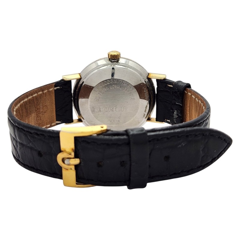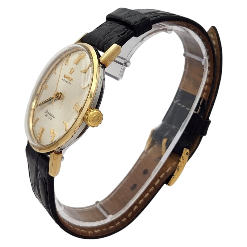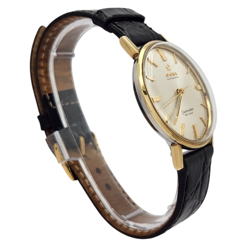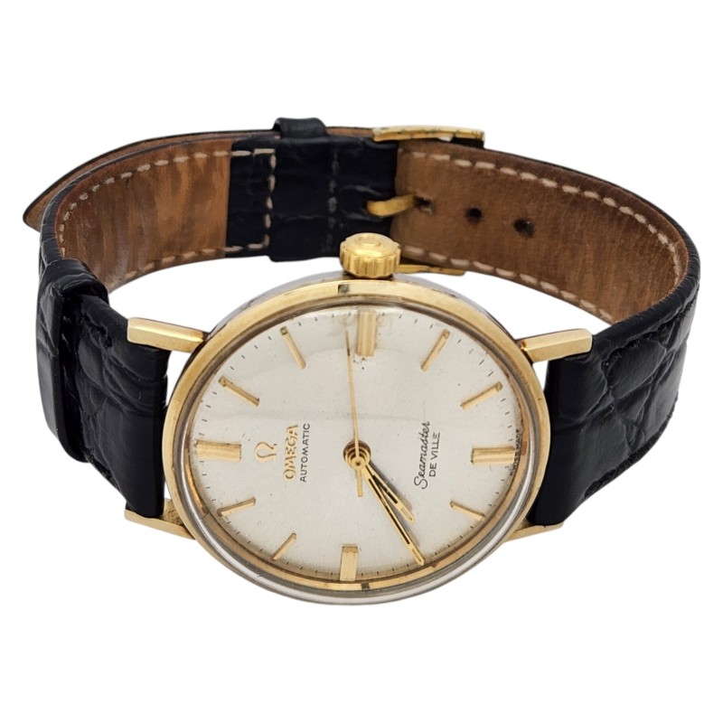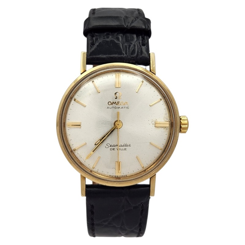 This OMEGA dress watch from 1976 is a timeless classic that exudes sophistication. The sleek stainless steel case and black leather strap create a refined, elegant look perfect for formal occasions or everyday wear. The analog display with gold-tone hands and indices provides a clean, minimalist aesthetic. This pre-owned timepiece has been meticulously maintained, ensuring reliable performance and a touch of vintage charm.
