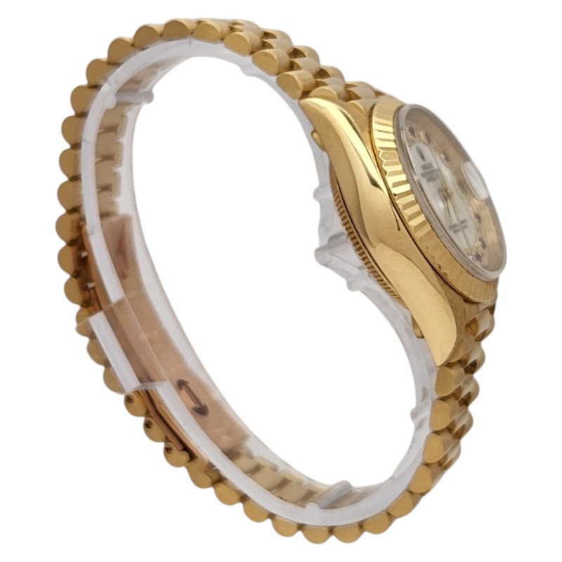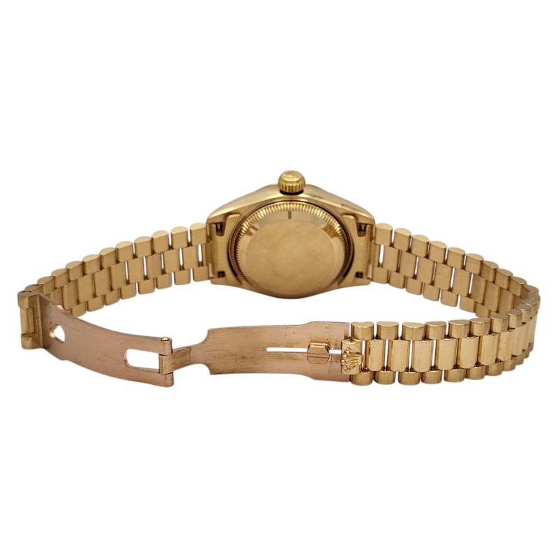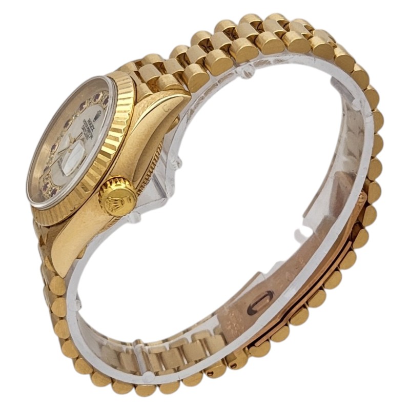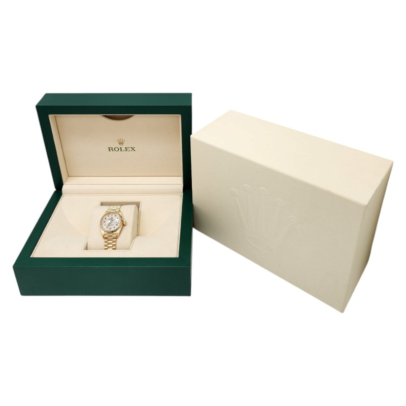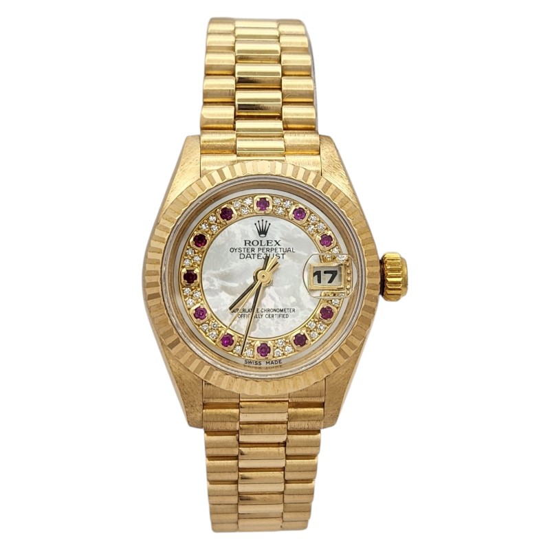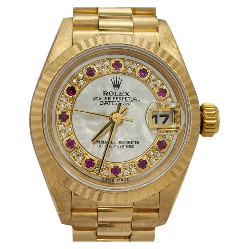 This stunning ROLEX 69178 ladies' dress watch is a true classic. The 18K gold band complements the exquisite mother-of-pearl face, creating a timepiece of exceptional elegance. Crafted with precision and attention to detail, this watch is a testament to the brand's renowned craftsmanship. With a case size of 26mm, it offers a refined and sophisticated look that effortlessly transitions from day to night. Accompanied by its original certification, this pre-owned ROLEX timepiece is a timeless investment piece that will elevate any ensemble.