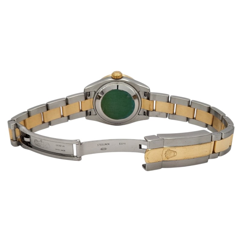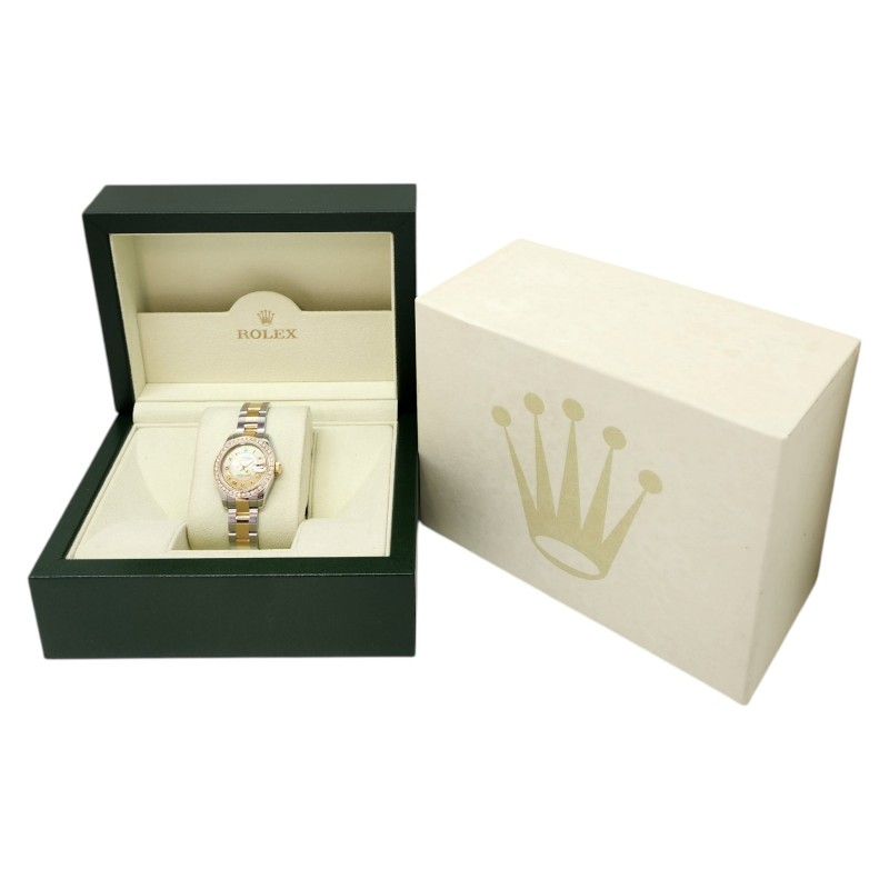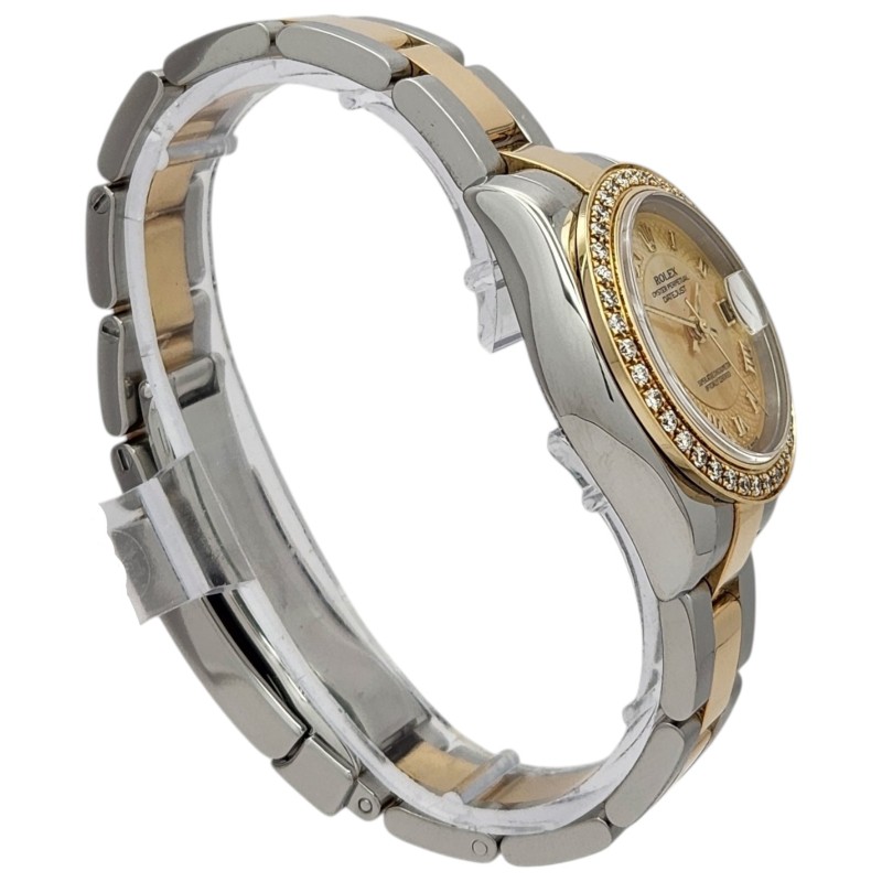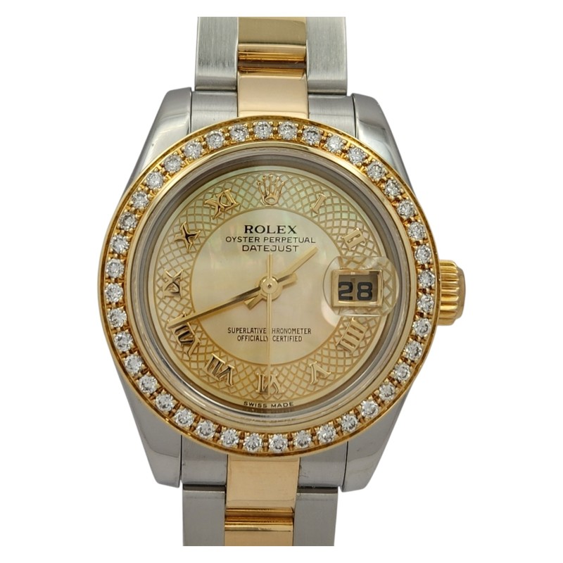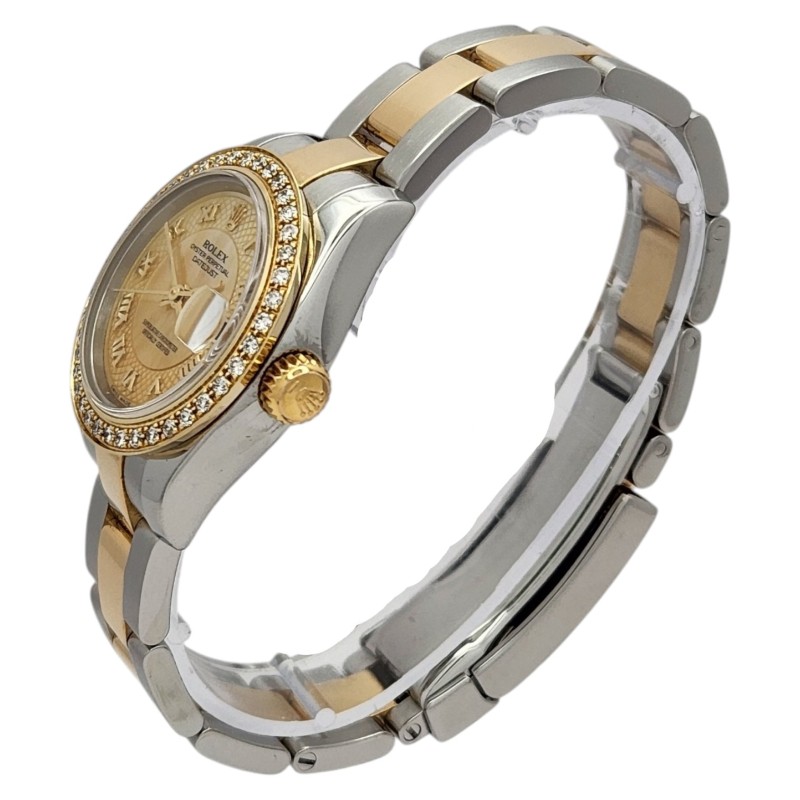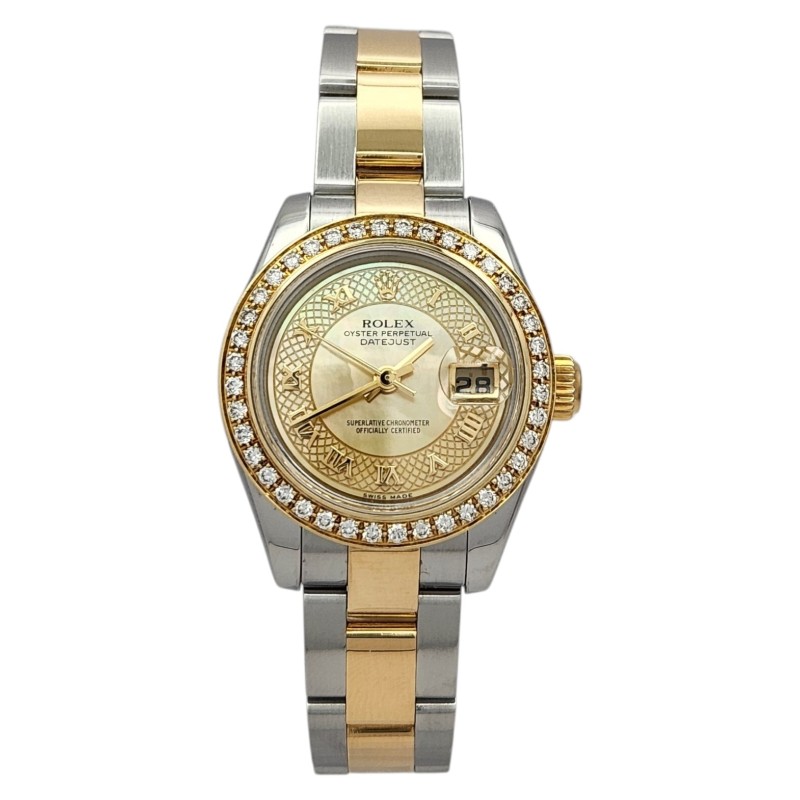 This elegant ROLEX 179173 dress watch combines timeless sophistication with refined craftsmanship. Featuring a striking yellow mother of pearl dial paired with a diamond bezel, this unisex timepiece exudes luxury and style. The circular face displays Roman numerals in classic fashion, whilst the combination of silver and yellow tones creates a distinctive two-tone aesthetic that complements any occasion.
