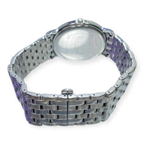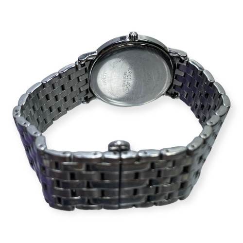 This Maurice Lacroix Les Classiques Date watch features a sleek silver metal band and a matching silver metal face. The face displays the time in classic Roman numerals, providing a timeless and sophisticated look. The engraved details on the face add a touch of elegance to this dress watch. Suitable for the discerning gentleman, this pre-owned timepiece is a versatile accessory that can be dressed up or down to suit any occasion.