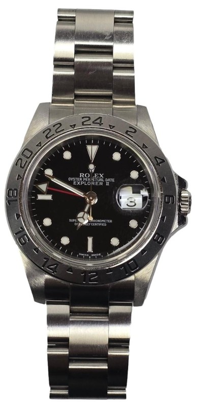 This sleek and sophisticated Rolex Oyster Perpetual Date Explorer II watch is a testament to the brand's commitment to precision and timeless design. With its silver metal band and black circular face, this sports watch exudes a classic yet modern aesthetic that seamlessly transitions from the office to the outdoors. Crafted in the year 2000, this Swiss-made timepiece boasts a range of features that make it a reliable and versatile companion.