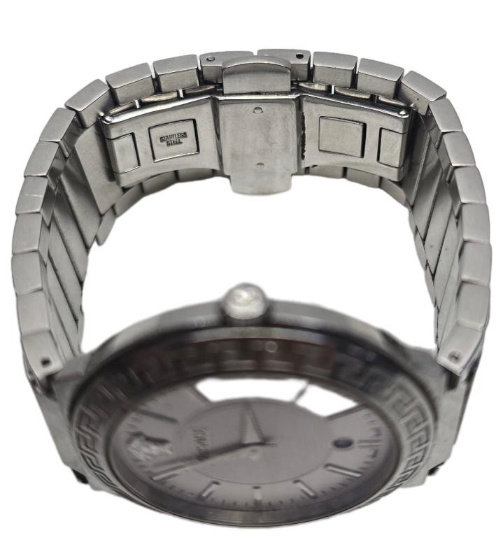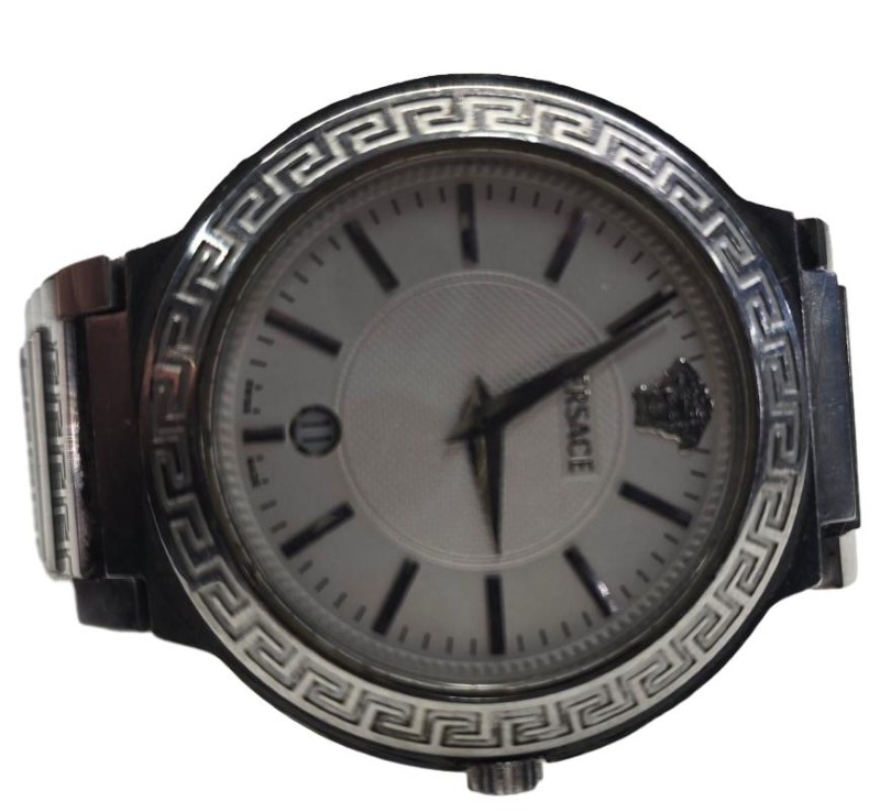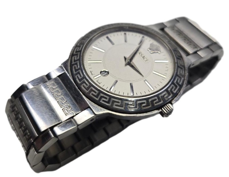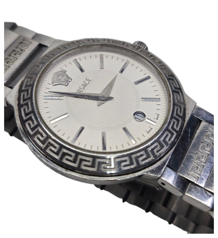 This classic Versace Medusa Date ZLQ99 wrist watch is a timeless accessory that exudes sophistication. The sleek silver metal band complements the elegant white metal face, which features Roman numeral hour markers for a refined, vintage-inspired look. The circular face shape and Medusa emblem lend an iconic Versace touch, making this a versatile piece suitable for both casual and formal occasions. With a weight of 108 grams, this men's watch is built to last.