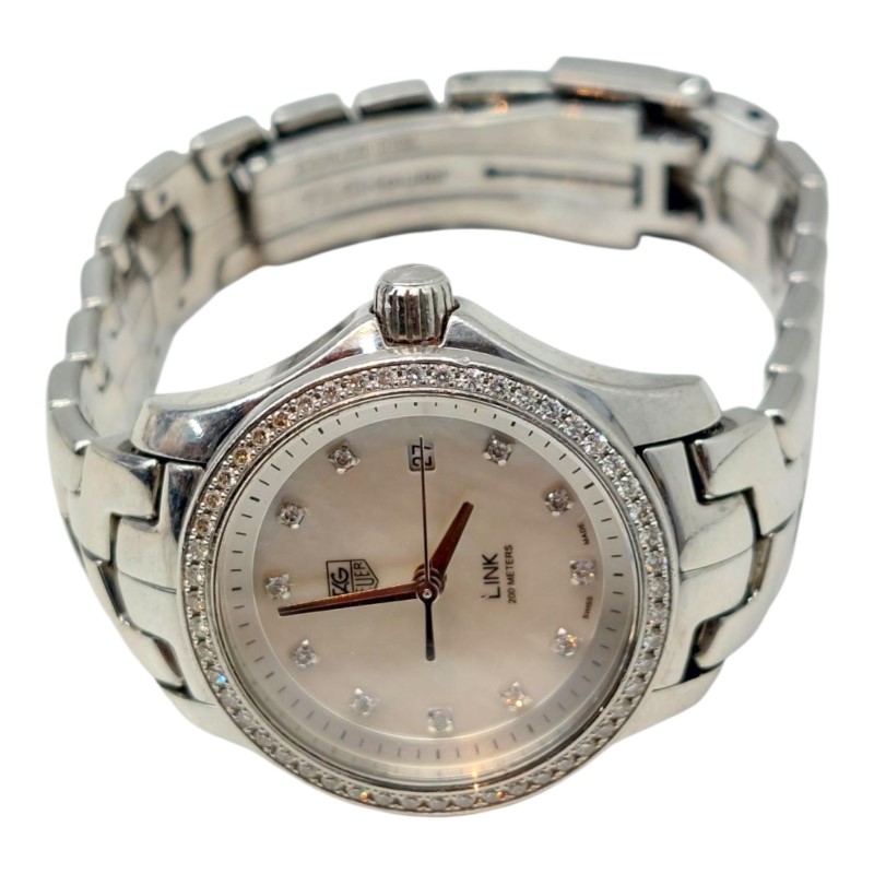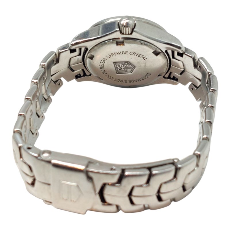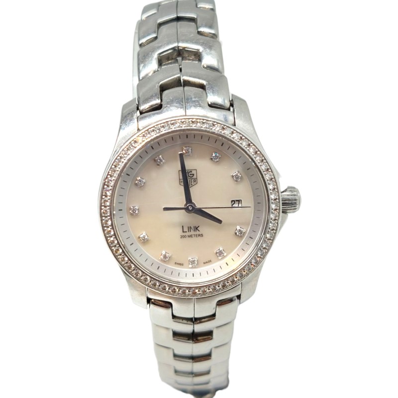 This elegant ladies' TAG HEUER LINK 200 METERS WJF1319 dress watch features a sleek silver steel band and a crisp white circular face. The robust build and 200-metre water resistance make it a versatile accessory for any occasion. The classic design and reliable quartz movement ensure timeless style and dependable performance.