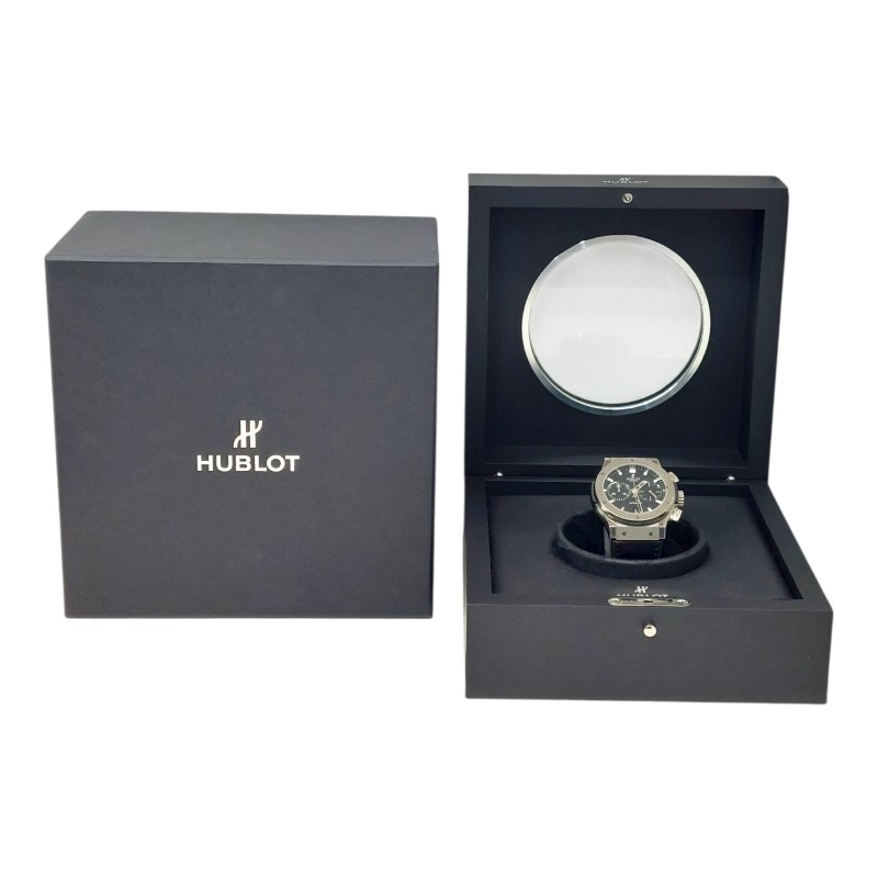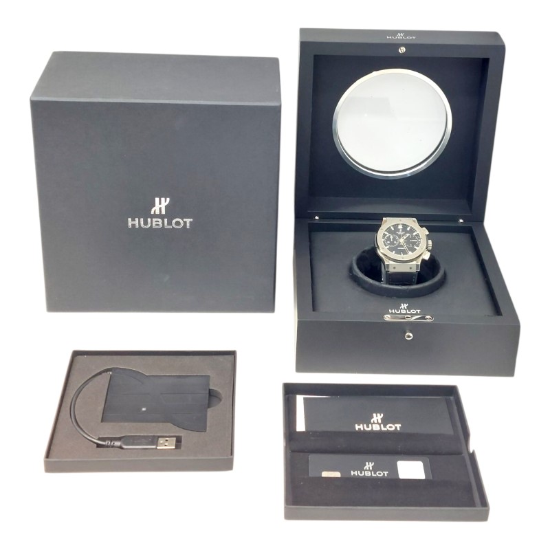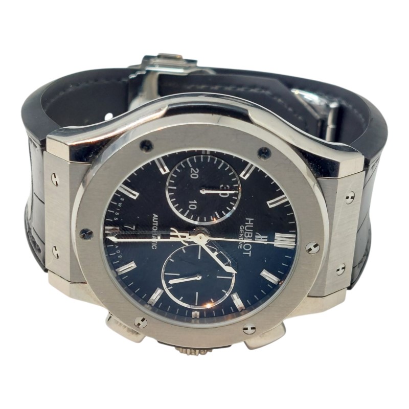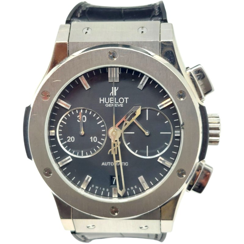 This pre-owned Hublot Geneve Classic Fusion 521.NX.1170.LR watch features a sleek black leather band and a round glass face. Crafted with precision, this chronograph timepiece is the perfect accessory for the modern gentleman. The robust 120.03g design ensures a comfortable and secure fit on the wrist.