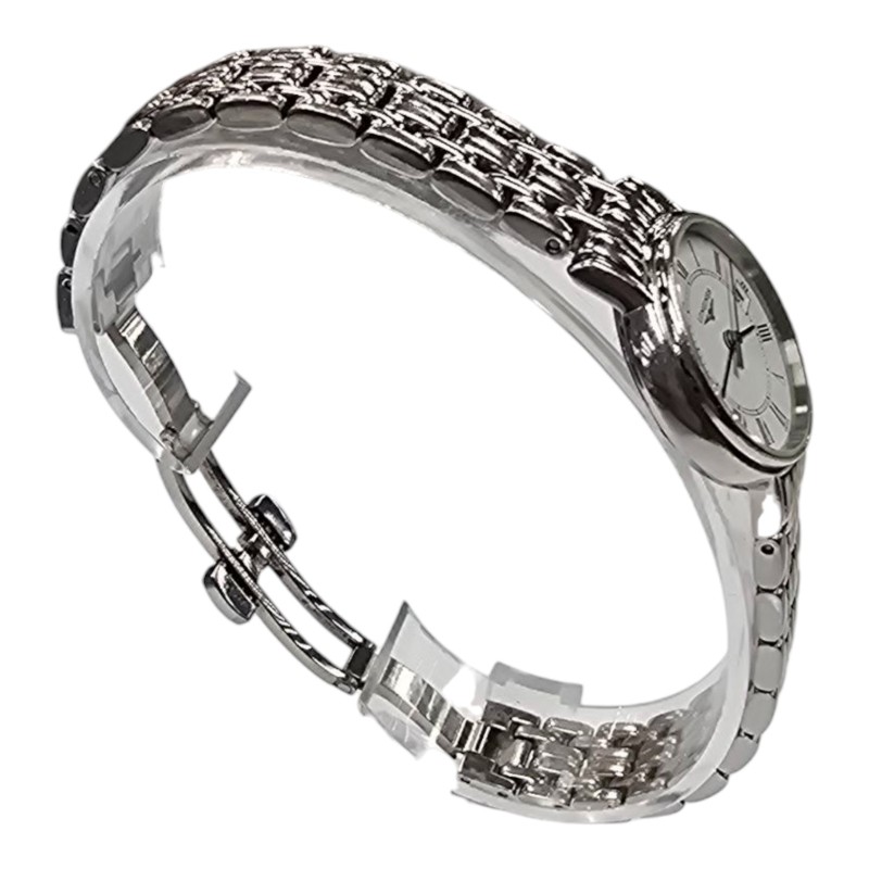 - Silver metal band for a polished, refined look