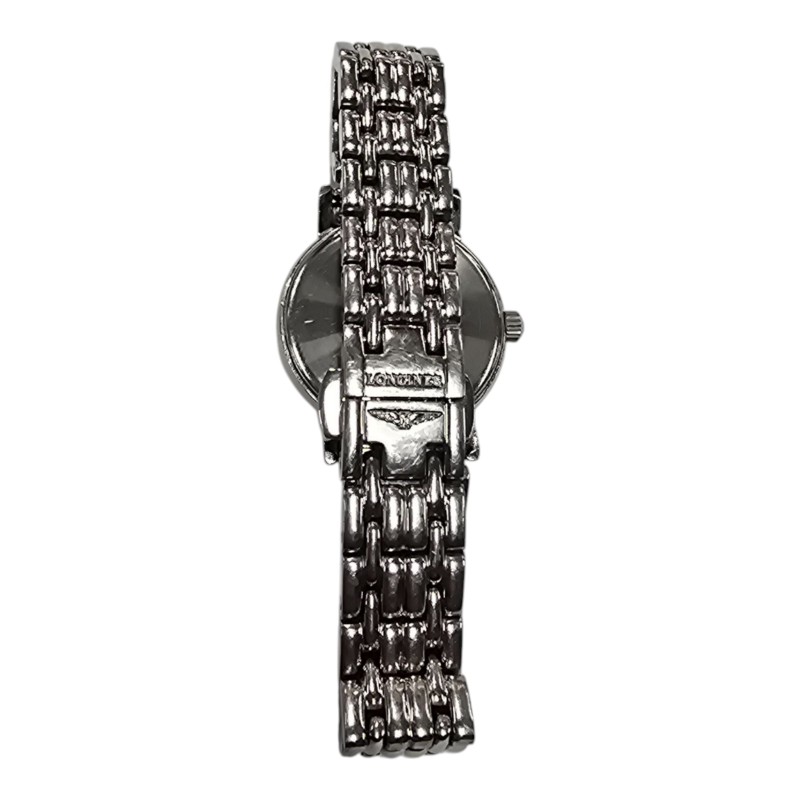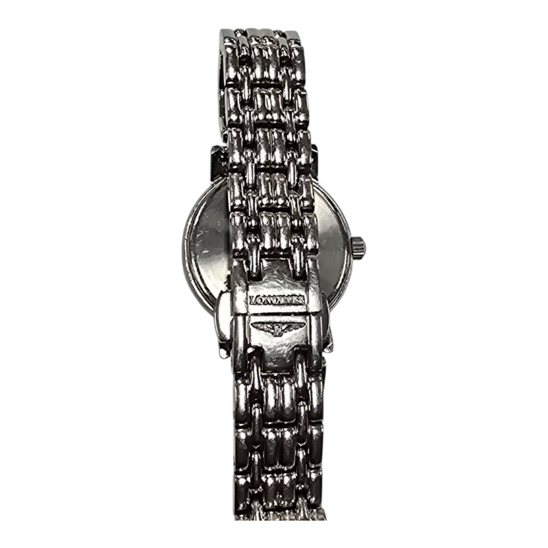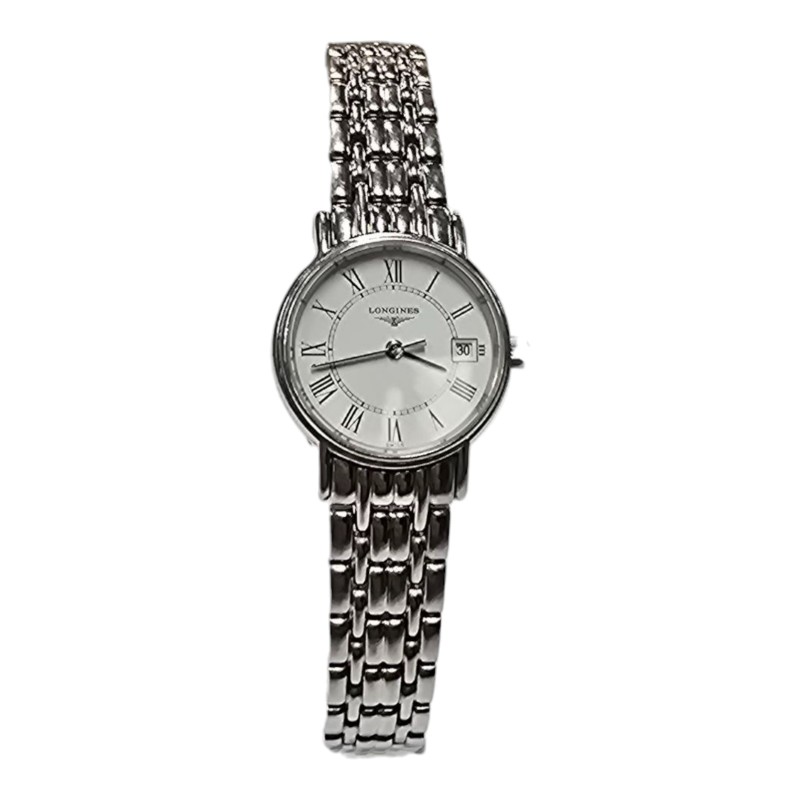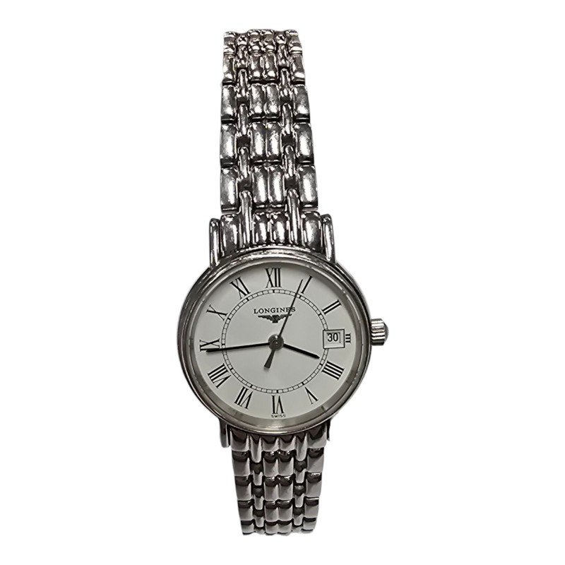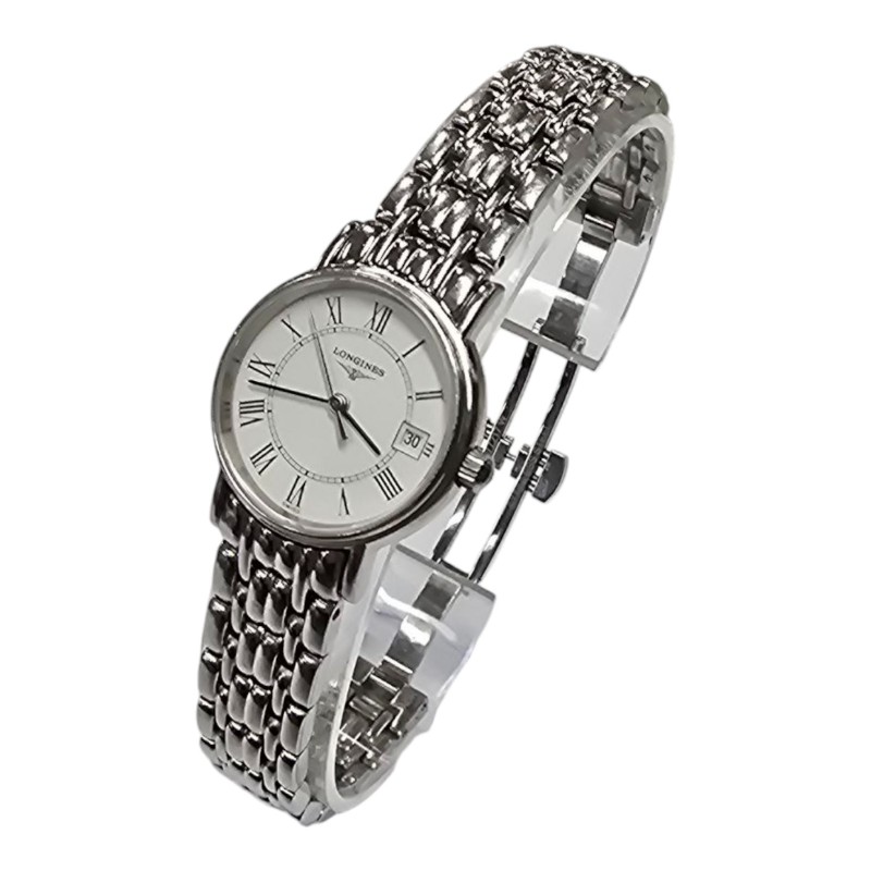 This elegant LONGINES L4.220.4 dress watch features a round white face with classic Roman numerals, set within a sleek silver metal band. Its timeless design makes it a versatile accessory that can be dressed up or down to suit any occasion. The high-quality metal construction ensures durability and a comfortable fit on the wrist. Whether you're looking for a sophisticated timepiece for the office or a stylish complement to your evening attire, this LONGINES watch is a sophisticated choice.