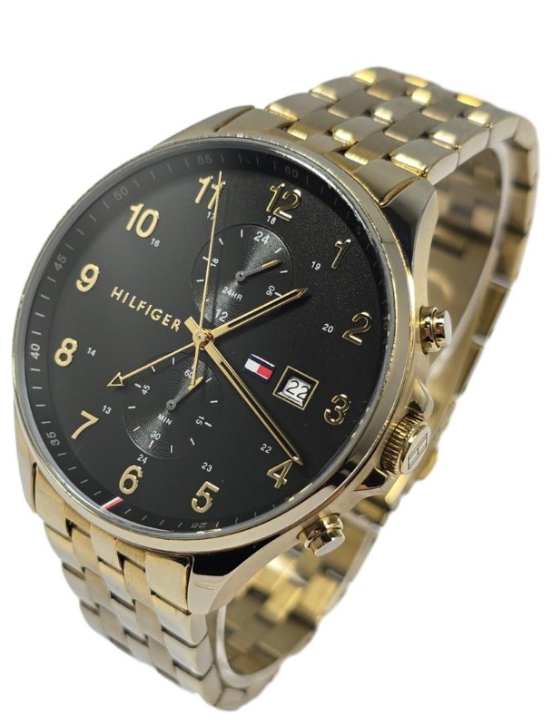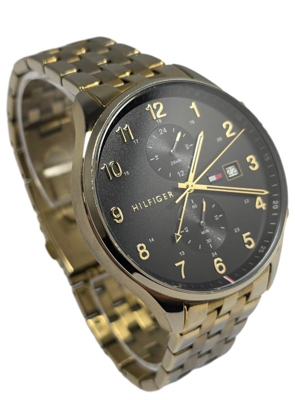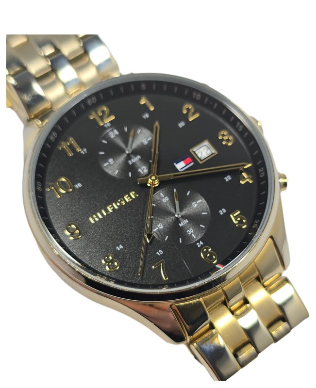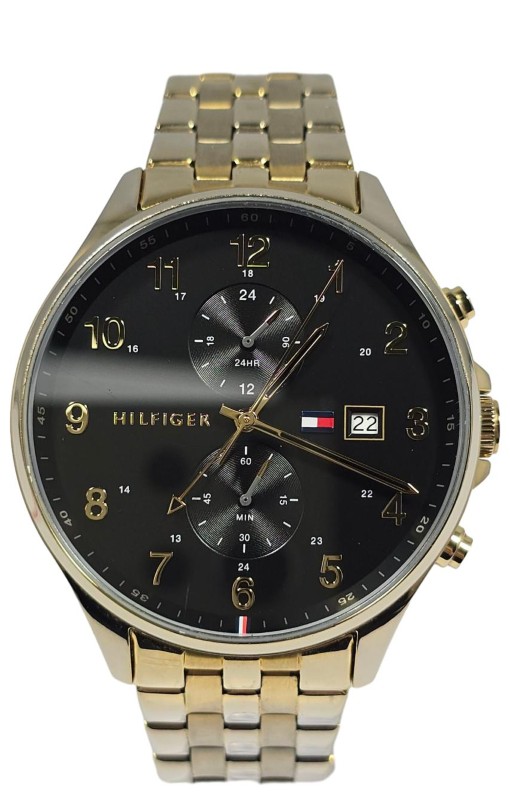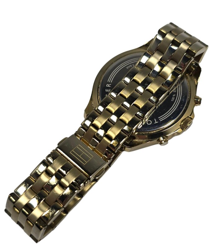 This pre-owned TOMMY HILFIGER TH 400.1.34.2896 dress watch features a sleek and sophisticated design. The gold-toned metal band complements the black circular face, which displays the time in a classic numeric format. This versatile timepiece is suitable for both formal and casual occasions, making it a practical addition to any man's wardrobe.