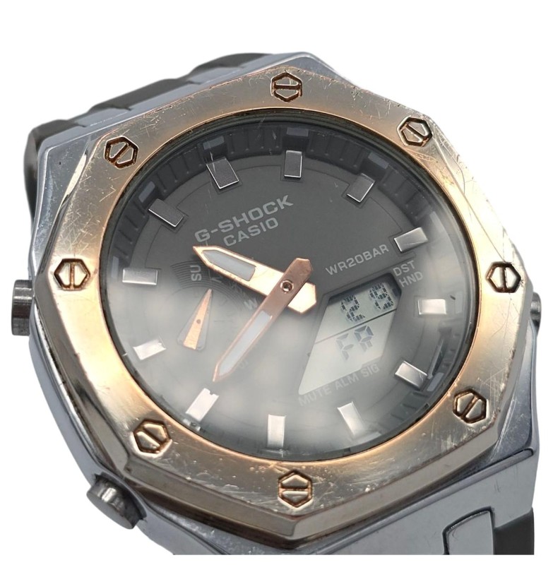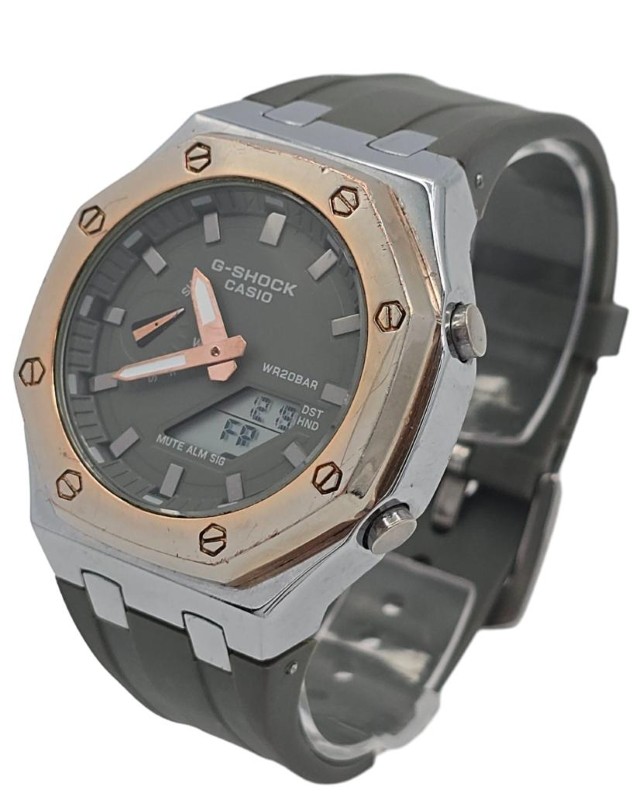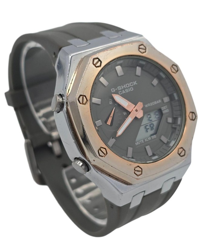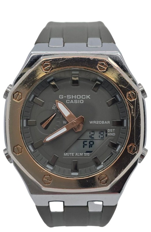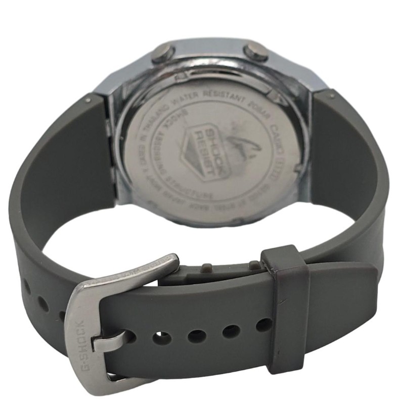 This CASIO G-2100 sports watch features a classic circular face with a grey display showing dashes. The grey plastic band complements the overall understated aesthetic, making this a versatile timepiece suitable for everyday wear. With its durable construction and reliable quartz movement, this secondhand watch is a practical choice for the active gentleman.