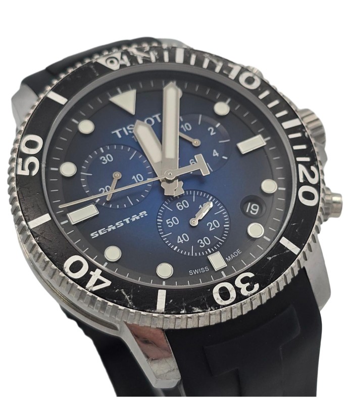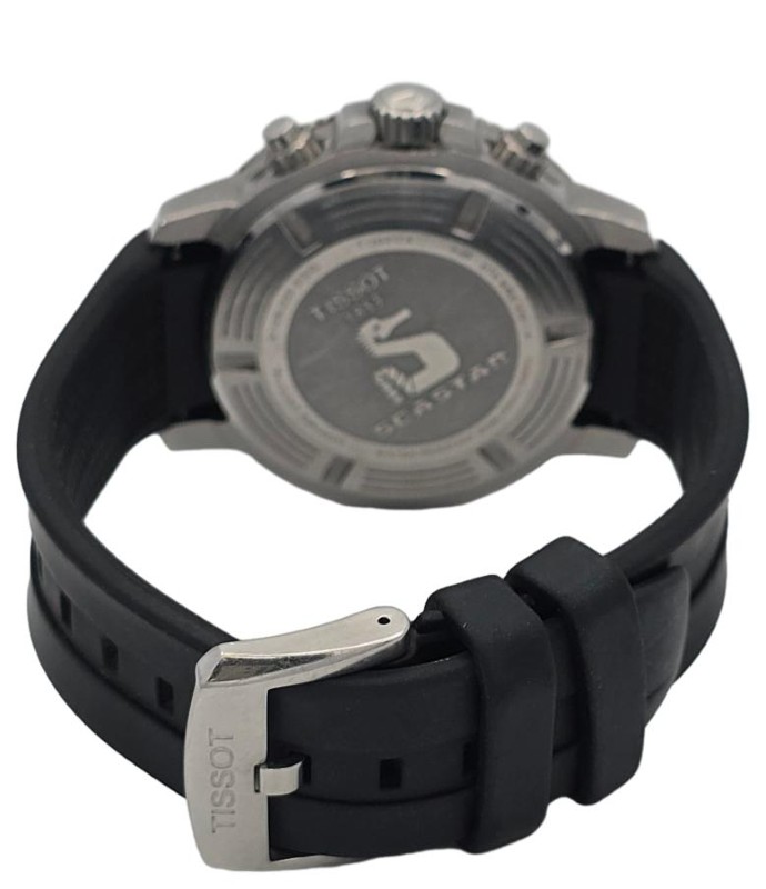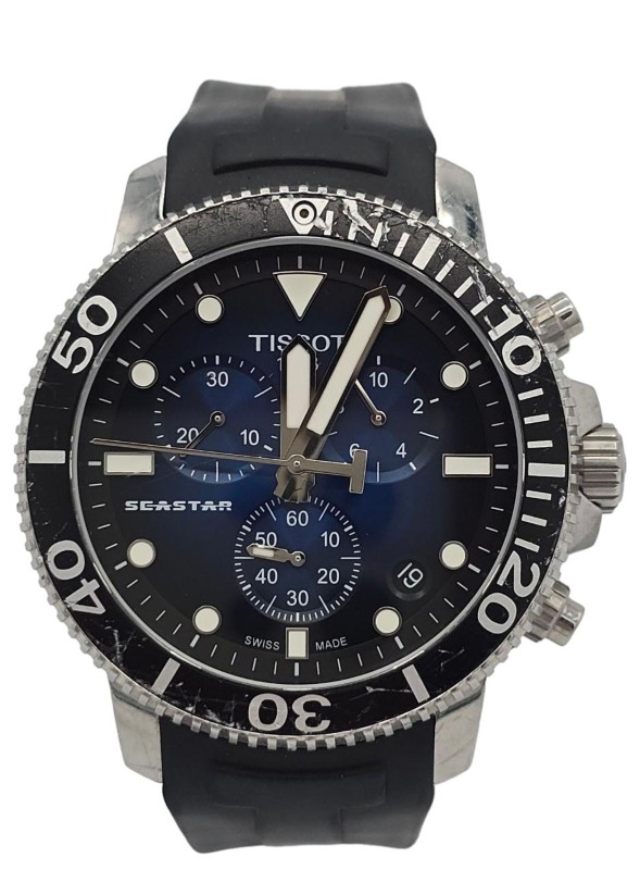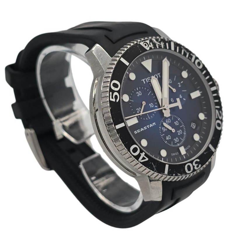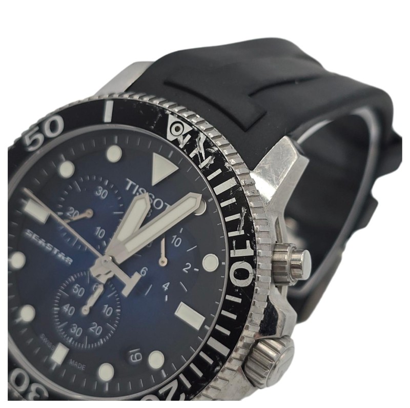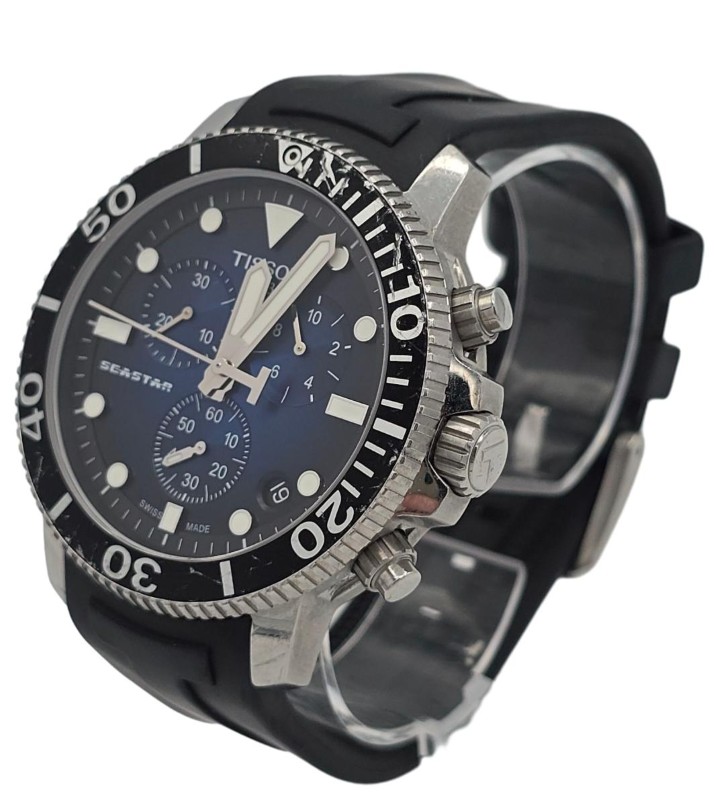 This pre-owned TISSOT T120417A Seastar watch features a sleek black plastic band and a striking blue plastic face with a multidial display. The circular face design offers a classic, timeless look that suits any occasion. As a chronograph model, this watch provides additional functionality for timing and tracking activities. Crafted with durable materials, this secondhand timepiece is a practical and stylish accessory.
