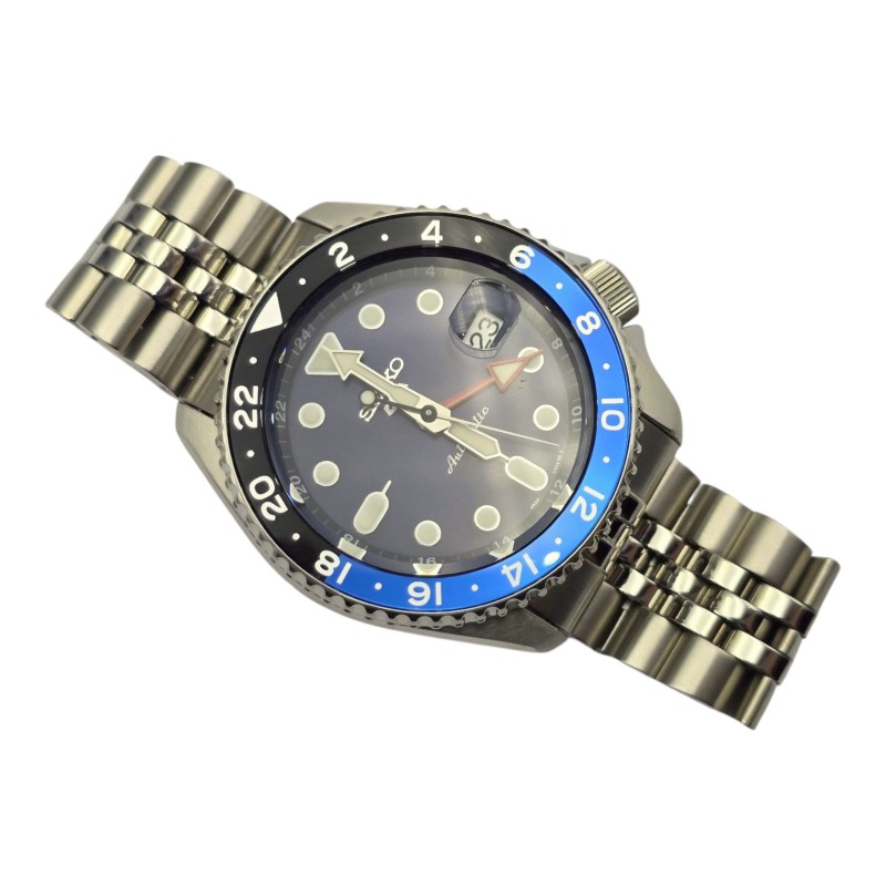 - Blue metal face with a circular design