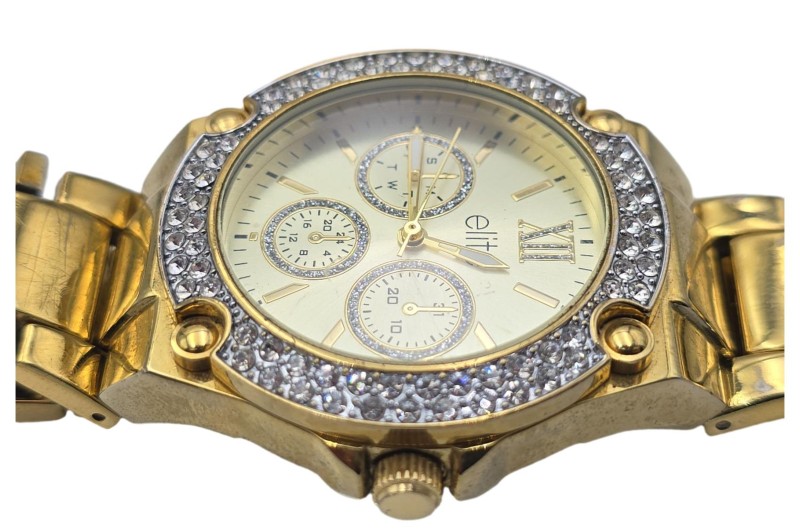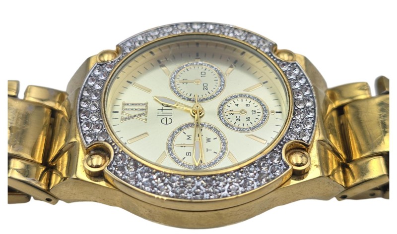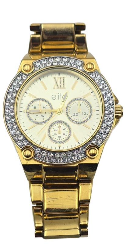 This elegant ELITE 5088090 ladies' dress watch features a classic circular face with a white dial and Roman numeral display. The sleek metal case and gold-toned band create a sophisticated, timeless look. The addition of CZ accents adds a touch of subtle sparkle. This pre-owned timepiece is a versatile accessory that can be dressed up or down to suit any occasion.