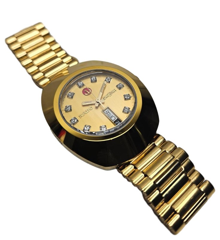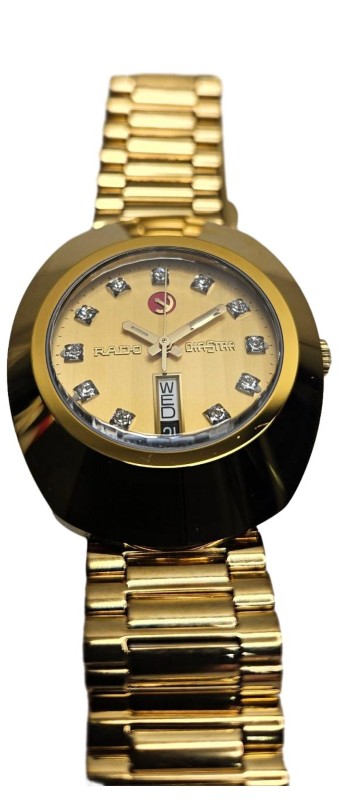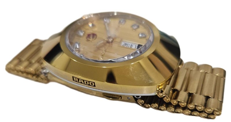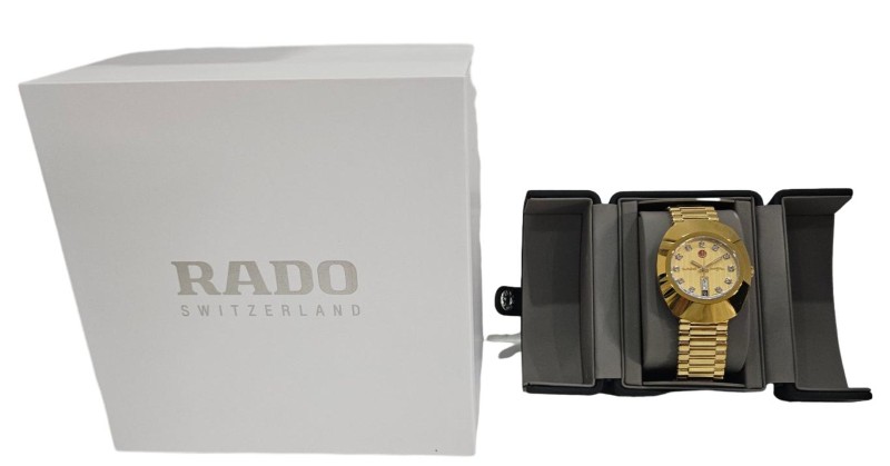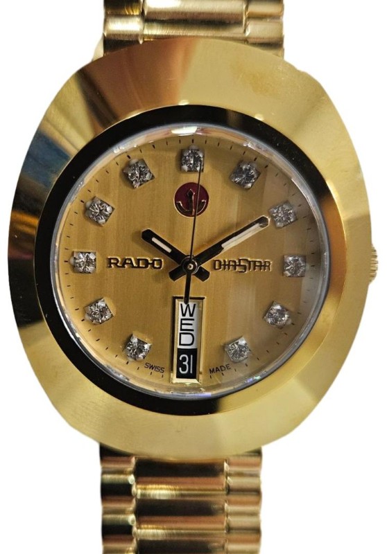 This elegant RADO DIASTAR AUTOMATIC 764.0413.3 watch features a stunning gold-coloured face with diamond hour markers and a durable sapphire crystal. The stainless steel band in a complementary gold tone adds a touch of sophistication. Suitable for any occasion, this unisex dress watch comes with the original box and spare links for a customised fit.
