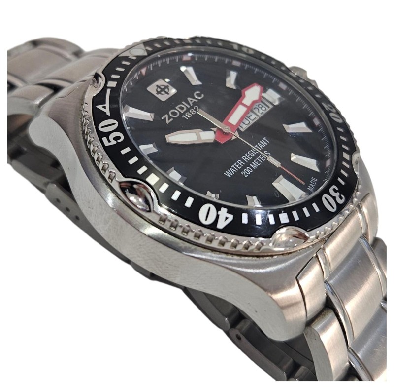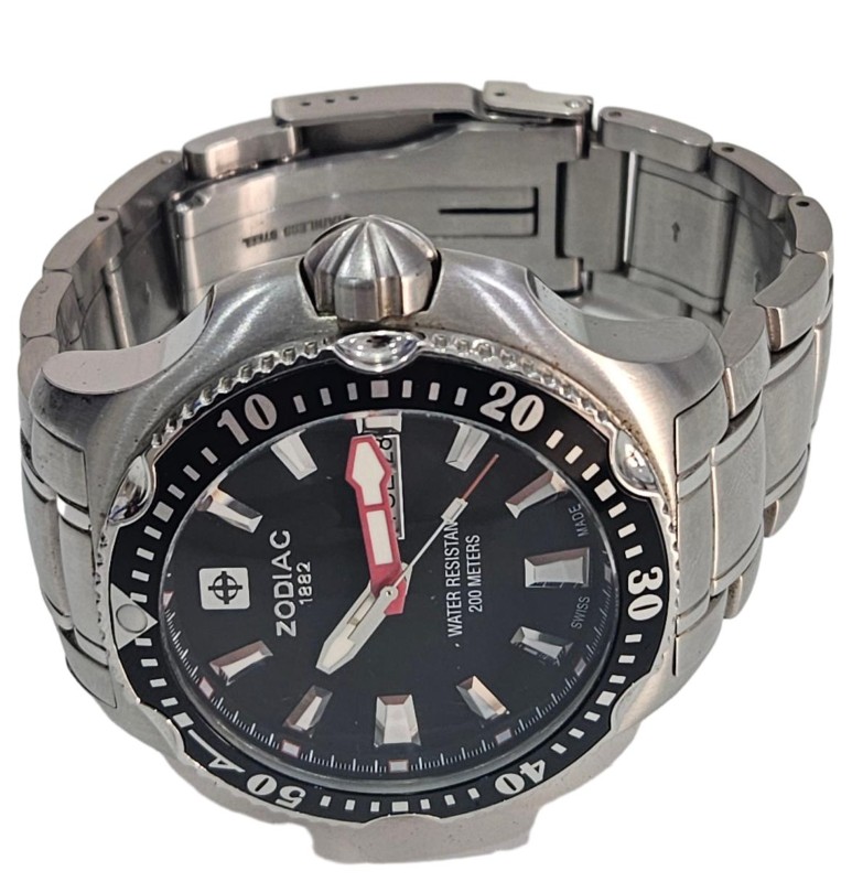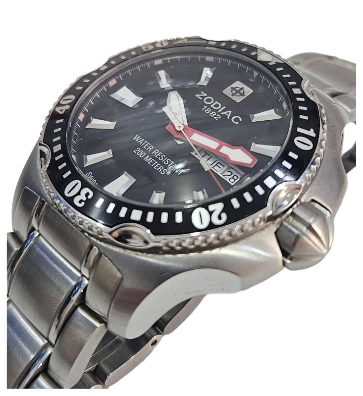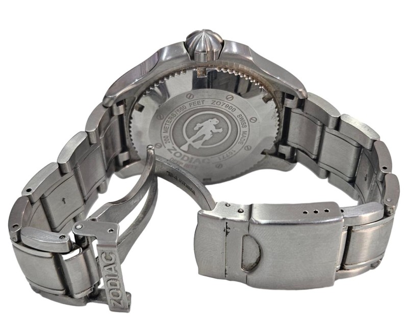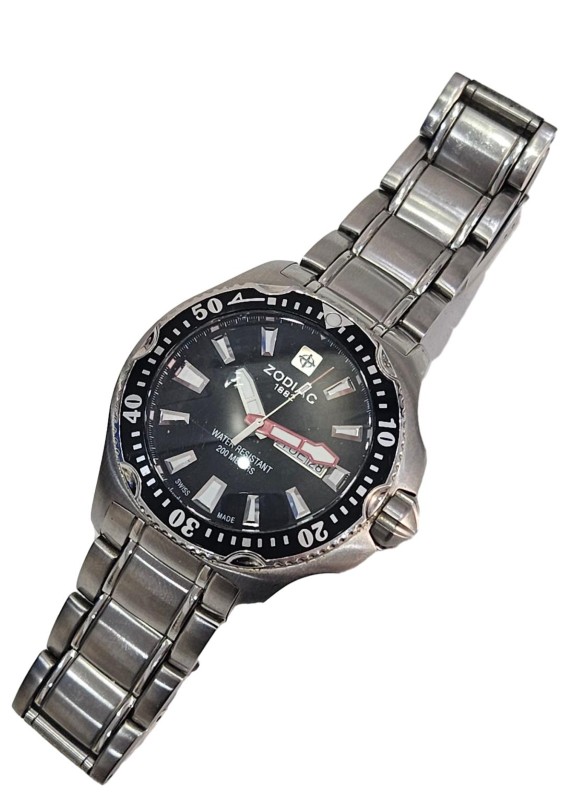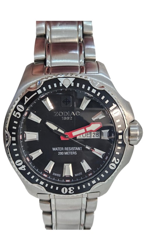 This ZODIAC "DEEP REEF" ZO7900 watch is a stylish and versatile timepiece that effortlessly blends form and function. Its 46mm circular face, crafted from durable glass, features an analogue display with a day and date indicator, allowing you to stay organised with a glance. The stainless steel case and silver band provide a sleek, sophisticated look, while the rotating bezel adds a touch of modern flair. Rated for 200m water resistance, this Swiss-made watch is well-equipped for both formal and casual occasions.