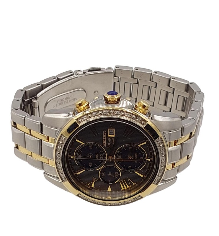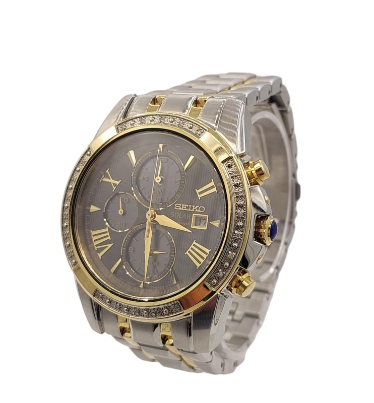 This SEIKO Le Grand Sport Solar Diamond Set SSC312P-9 watch features a sleek silver stainless steel band and a stylish gray face with a classic circular design. The face is crafted from durable sapphire and displays the time in a simple numerical format, making it a versatile dress watch suitable for any occasion. The solar-powered movement ensures reliable timekeeping without the need for frequent battery changes. This pre-owned watch comes complete with the original box.