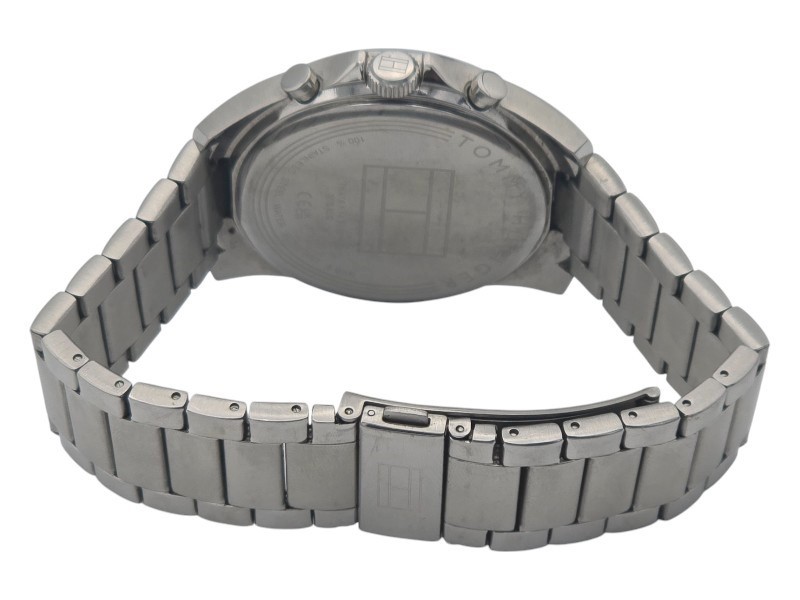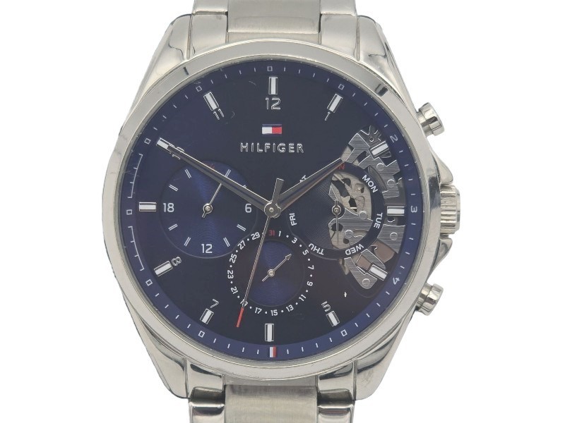 This pre-owned TOMMY HILFIGER TH 419.1.14.3030 dress watch features a sleek silver stainless steel band and a striking blue circular face. Suitable for the modern gentleman, this timepiece will complement a range of formal and casual attire. While the band shows minor signs of wear, the watch remains in good overall condition and will fit wrists up to 21cm.