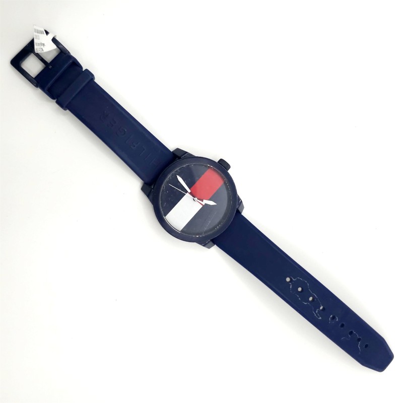 This pre-owned Tommy Hilfiger dress watch features a blue plastic band and a circular metal face. Suitable for all genders, it has a classic and versatile design that can be dressed up or down. The watch comes with a box.