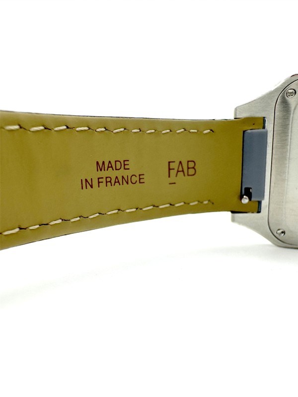 This stunning CARTIER SANTOS DE CARTIER watch features a classic square face with a white dial displaying Roman numerals. The durable sapphire crystal face is complemented by a sleek blue leather band, creating a sophisticated and timeless look. Weighing in at 41.23 grams, this unisex dress watch exudes elegance and style. The engraved CARTIER branding on the face adds a touch of exclusivity to this exceptional timepiece.