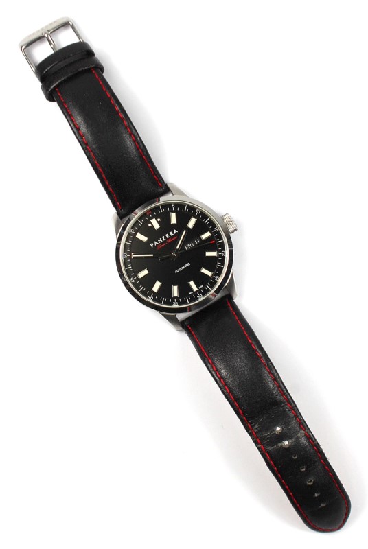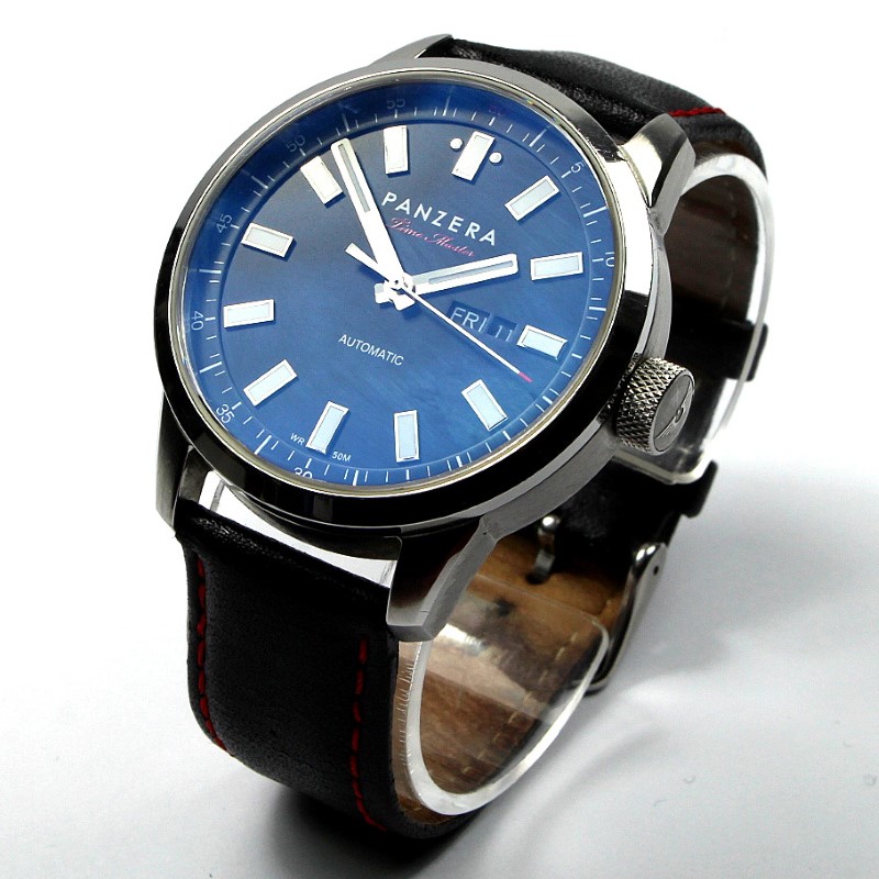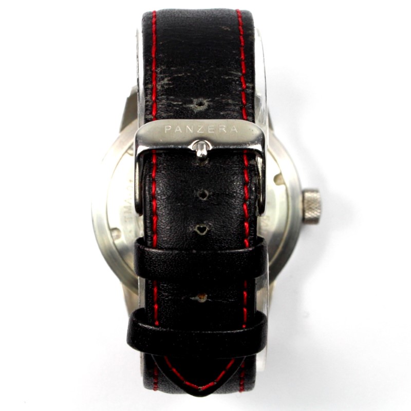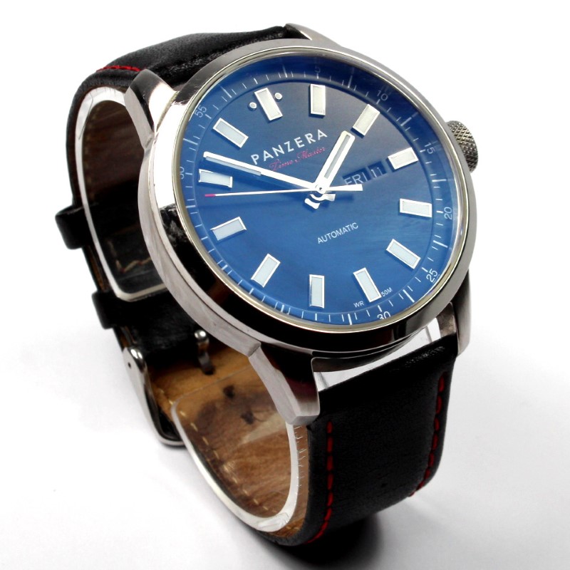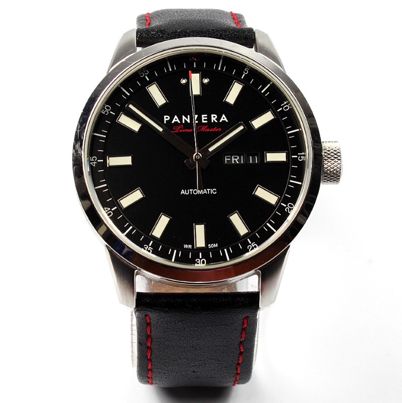 This sleek and sophisticated Panzera TMA-01 Time Master Endurance MKI watch is a stylish accessory that exudes a timeless elegance. Crafted with a black leather band and a metal face in a classic circular shape, this dress watch offers a range of practical features, including time, day, and date display. Its durable construction and understated design make it a versatile choice for both formal and casual occasions.