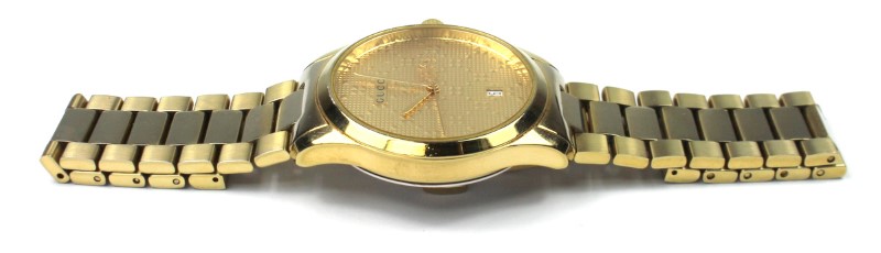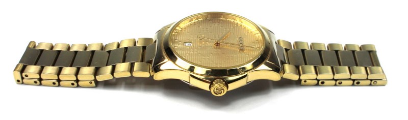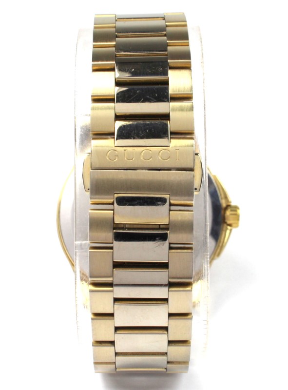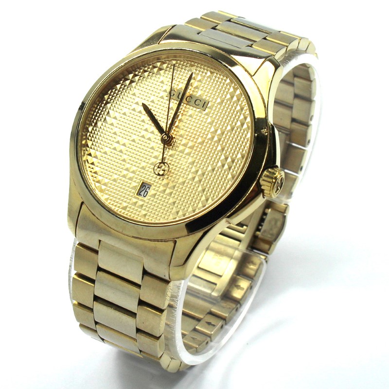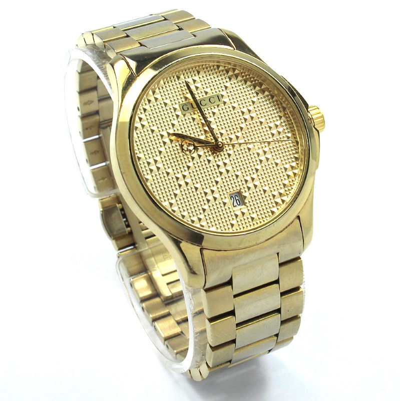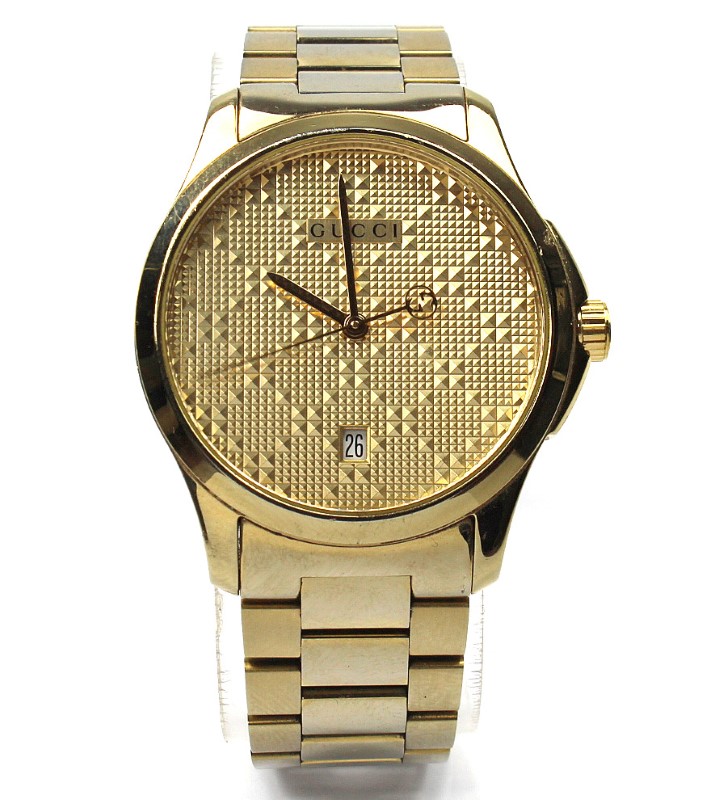 This pre-owned GUCCI G-Timeless Gold Diamond Dial Quartz 38mm YA126461A watch is a sophisticated timepiece that exudes elegance. The circular face, crafted from metal, features a striking gold hue and displays the time and date. The gold-toned band, made of gold, complements the face seamlessly, creating a cohesive and stylish look. The engraving details add a unique touch to this dress watch, making it a versatile accessory for both formal and casual occasions.