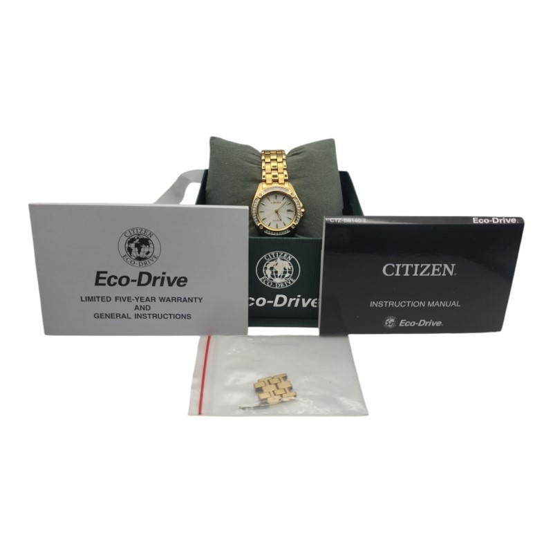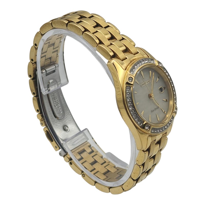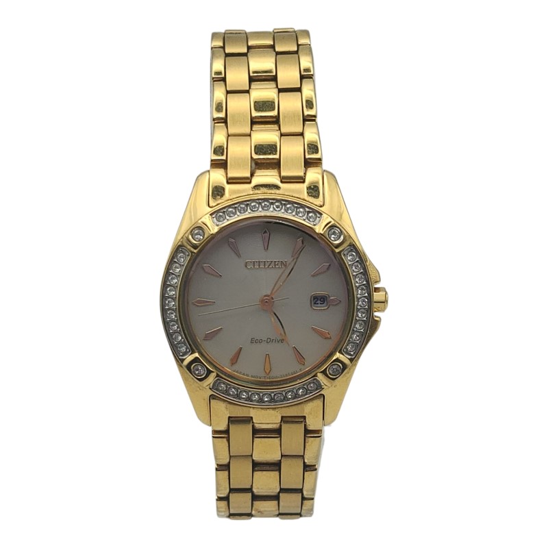 This elegant CITIZEN GNOS9 ladies' wrist watch features a circular face with a clean white display and glass construction. The gold-toned metal band complements the sophisticated design. The watch face is adorned with subtle lines and sparkling cubic zirconias, adding a touch of glamour. This versatile timepiece can be dressed up or down to suit any occasion.
