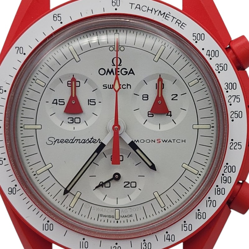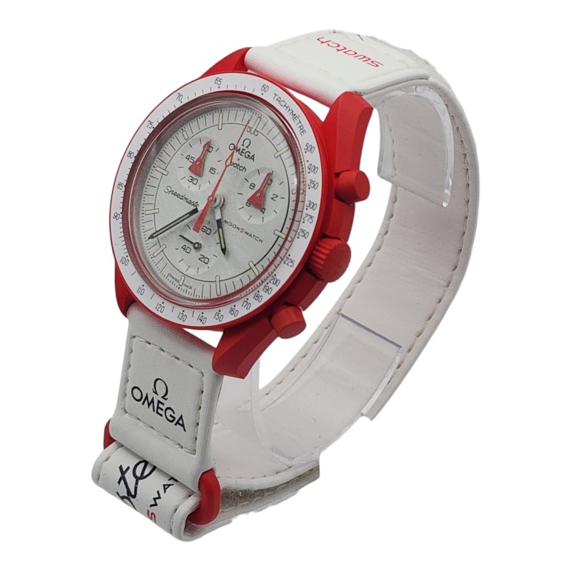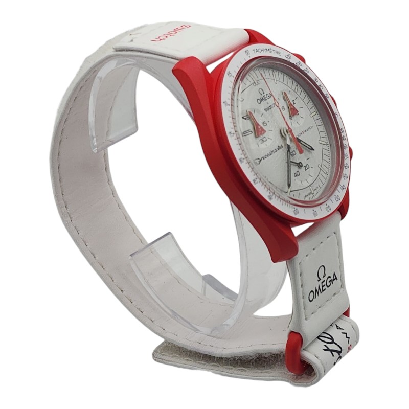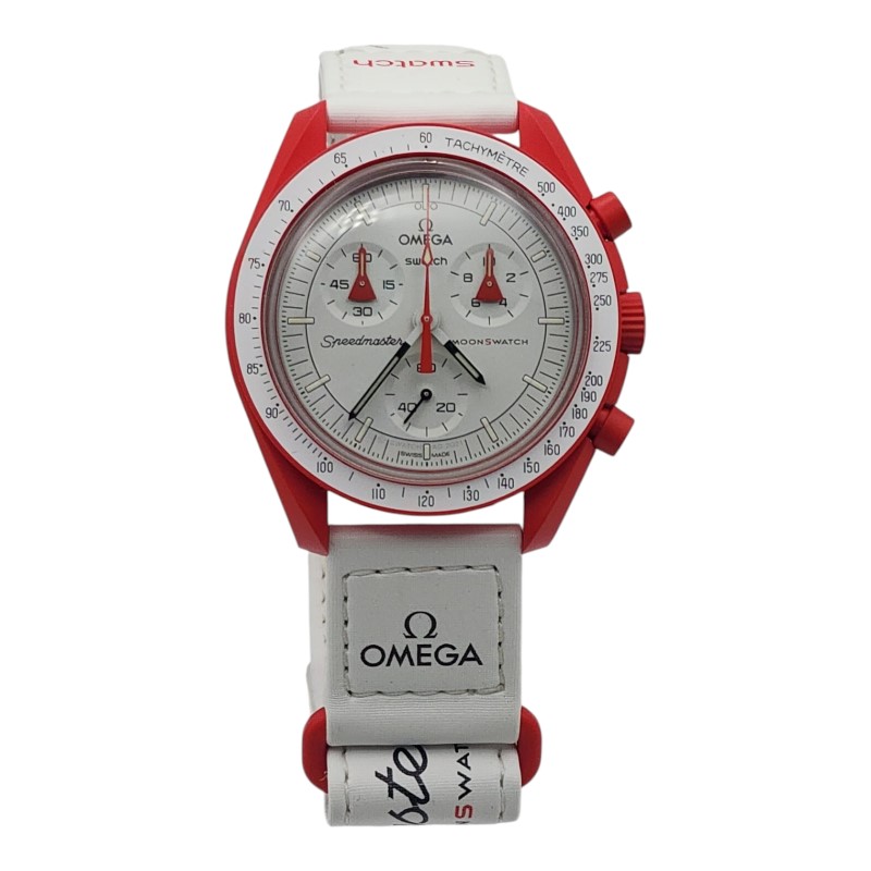 This OMEGA X SWATCH Mission to Mars watch features a crisp white nylon band and a circular glass face with a clean lines display. Designed for unisex wear, this chronograph timepiece offers a stylish and practical accessory for everyday use. The durable construction and minimalist aesthetic make it a versatile choice that can be dressed up or down to suit any occasion.