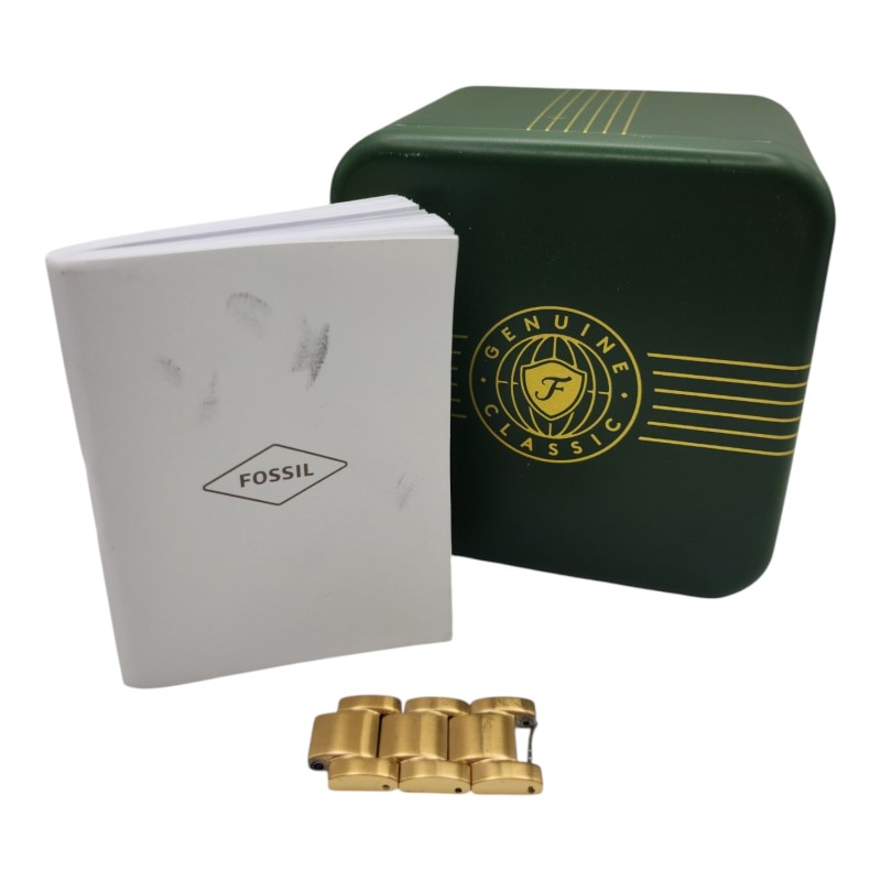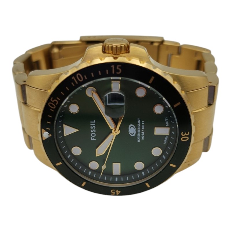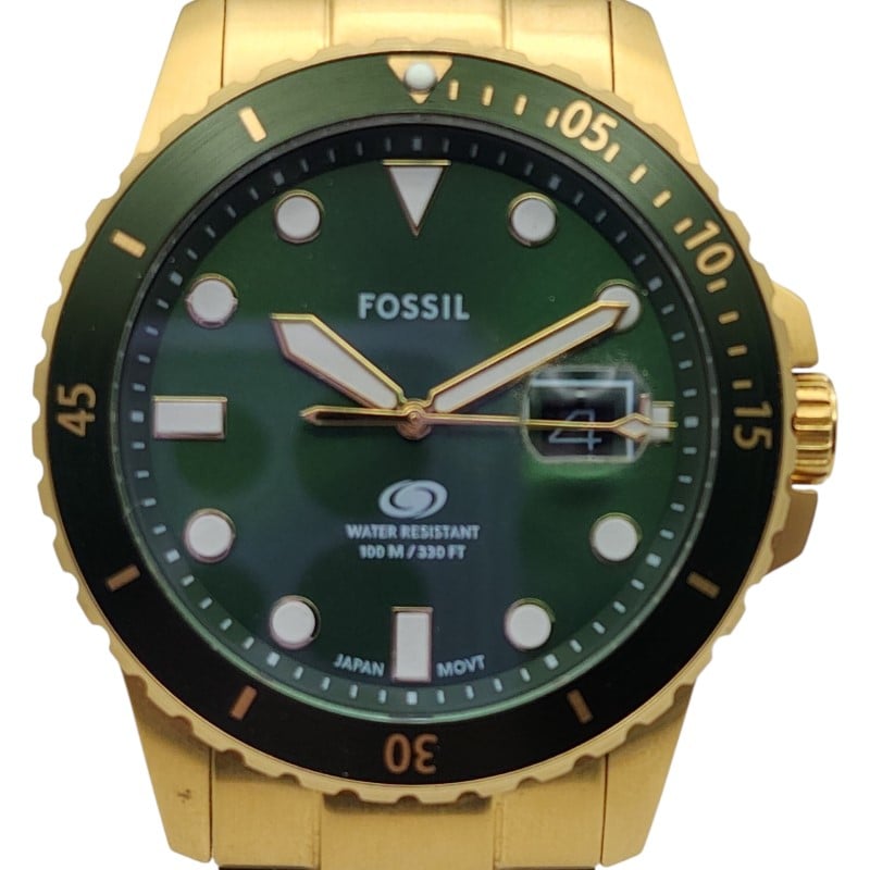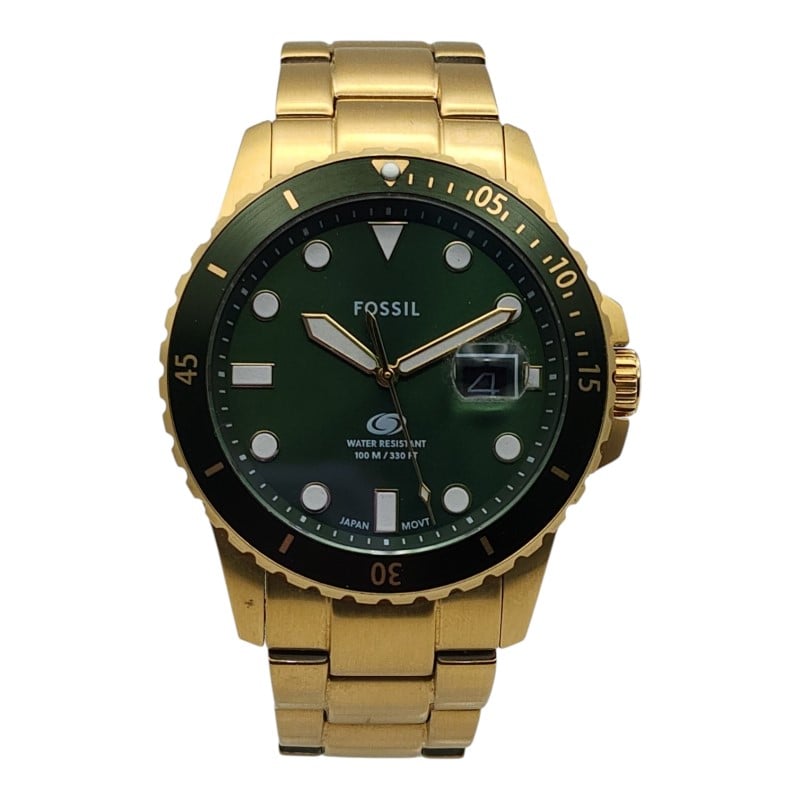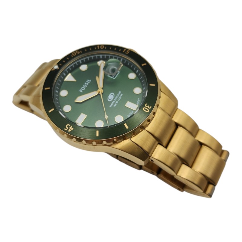This vintage FOSSIL FS6030 Blue Dive Analogue watch features a bold and stylish design. The gold-toned metal band complements the circular green face, which displays the time with a dot pattern. This classic timepiece is suitable for everyday wear and can elevate any casual or formal outfit.